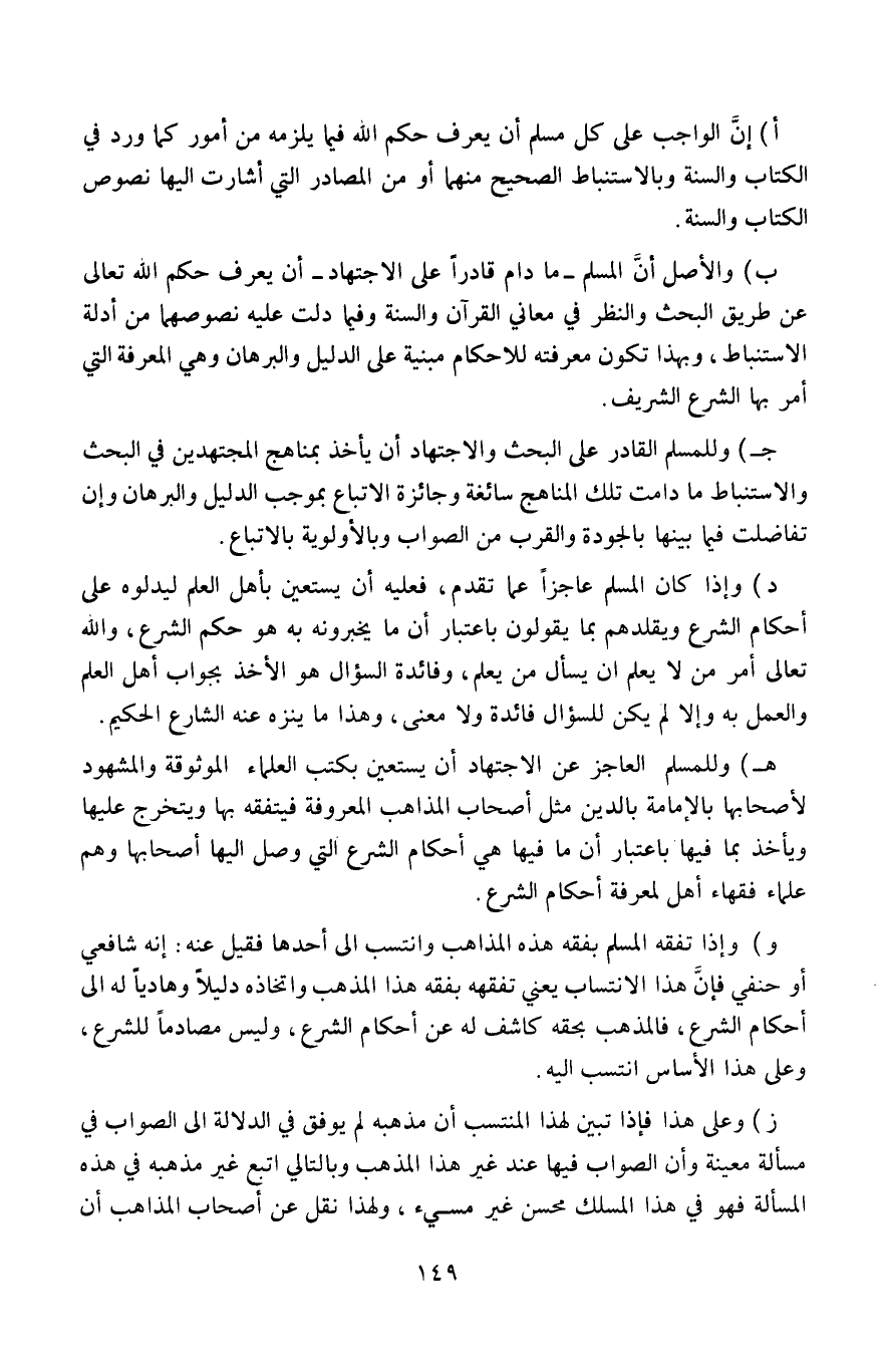 أ- إن الواجب على كل مسلم أن يعرف حكم الله فيما يلزمه من أمور، كما ورد في الكتاب والسنة وبالاستباط الصحيح منهما، أو من المصادر التي أشارت إليها نصوص الكتاب والسنة.