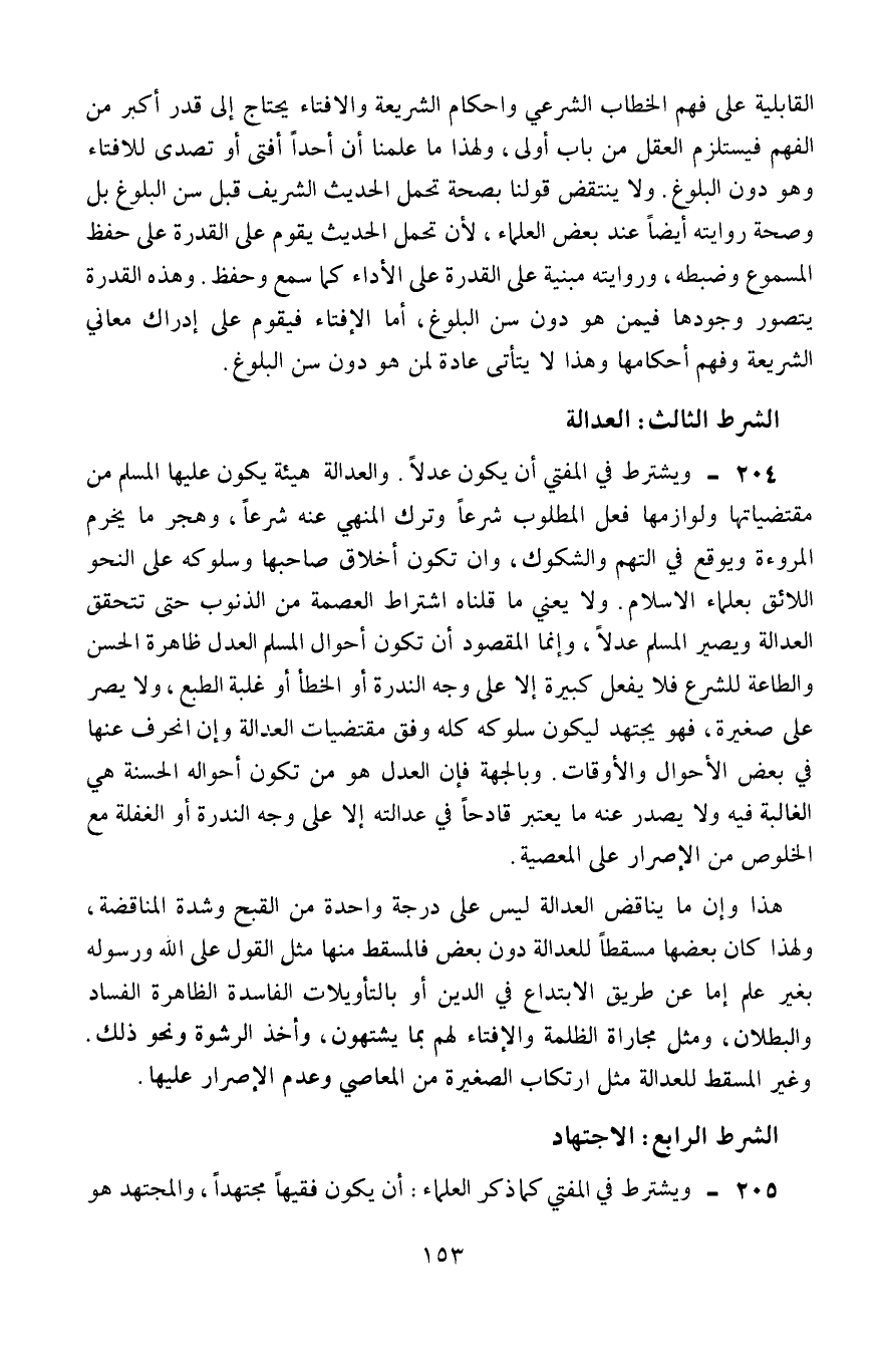 204- ويشترط في المفتي أن يكون عدلًا، والعدالة هيئة يكون عليها المسلم، من مقتضياتها ولوازمها فعل المطلوب شرعًا وترك المنهيّ عنه شرعًا، وهجر ما يخرم المروءة ويوقع في التهم والشكوك، وأن تكون أخلاق صاحبها وسلوكه على النحو اللائق بعلماء الإسلام، ولا يعني ما قلنا اشتراط العصمة من الذنوب حتى تتحقق العدالة بعلماء الإسلام، وإنما المقصود أن تكون أحوال المسلم العدل ظاهرة الحسن والطاعة للشرع، فلا يفعل كبيرة إلّا على وجه الندرة أو الخطأ أو غلبة الطبع، ولا يصدر على صغيرة، فهو يجتهد ليكون سلوكه كله وفق مقتضيات العدالة، وإن انحرف عنها الغالبة فيه، ولا يصدر عنه ما يعتبر قادحًا في عدالته إلّا على وجه الندرة أو الغفلة مع الخلوص من الإصرار على المعصية.