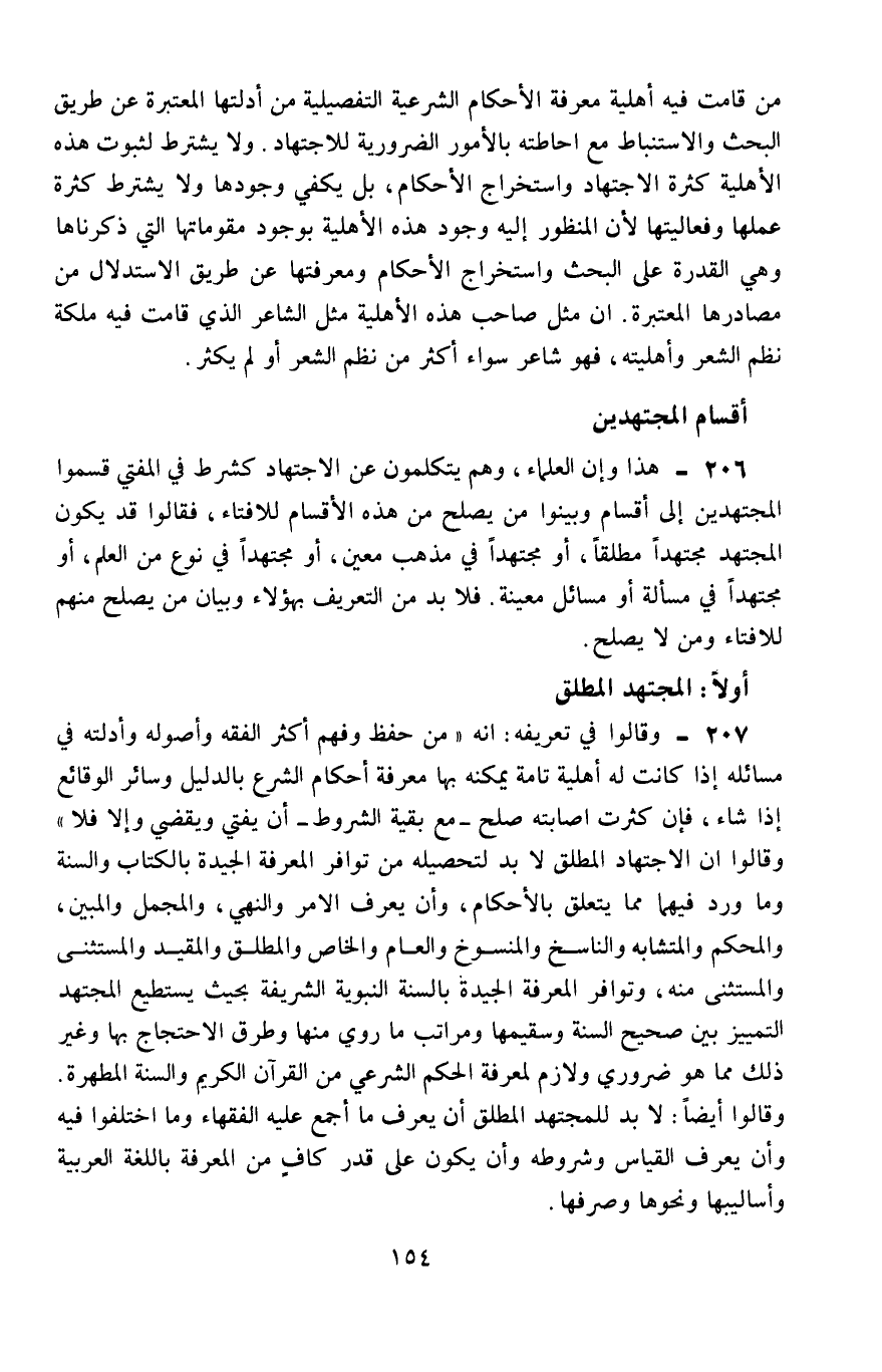 207- وقالوا في تعريفه: إنَّه "من حفظ وفهم أكثر الفقه وأصوله وأدلته في مسائله إذا كانت له أهليِّة تامَّة يمكنه بها معرفة أحكام الشرع بالدليل وسائر الوقائع إذا شاء، فإن كثرت إصابته صلح -مع بقية الشروط- أن يفتي ويقضي، وإلّا فلا" وقالوا: إنَّ الاجتهاد المطلق لا بُدَّ لتحصيله من توافر المعرفة الجيدة بالكتاب والسنة، وما ورد فيهما مما يتعلق بالأحكام، وأن يعرف الأمر والنهي، والمجمل والمبيّن، والمحكم والمتشابه، والناسخ والمنسوخ، والعام والخاص، والمطلق والمقيد، والمستثنى والمستثنى منه، وتوافر المعرفة الجيدة بالسنة النبوية الشريفة؛ بحيث يستطيع المجتهد التمييز بين صحيح السنة وسقيمها، ومراتب ما روي منها، وطرق الاحتجاج بها، وغير ذلك مما هو ضروري ولازم لمعرفة الحكم الشرعي من القرآن الكريم والسنة المطهرة.