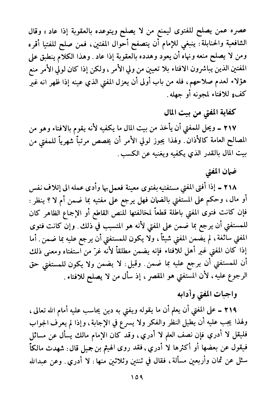 217- ويحلّ للمفتي أن يأخذ من بيت المال ما يكفيه؛ لأنه يقوم بالإفتاء، وهو من المصالح العامة كالأذان، ولهذا يجوز لولي الأمر أن يخصص مرتبًا شهريًّا للمفتي من بيت المال بالقدر الذي يكفيه ويغنيه عن الكسب؟