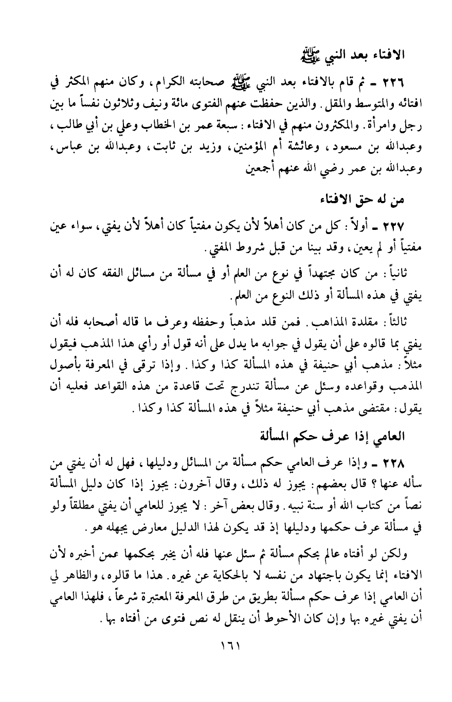 228- وإذا عرف العامي حكم مسألة من المسائل ودليلها، فهل له أن يفتي من سأله عنها؟ قال بعضهم: يجوز له ذلك، وقال آخرون: يجوز إن كان دليل المسألة نصًّا من كتاب الله أو سنة نبيه، وقال بعض آخر: لا يجوز للعاميّ أن يفتي مطلقًا، ولو في مسألة عرف حكمها ودليلها؛ إذ قد يكون لهذا الدليل معارض يجهله هو.
