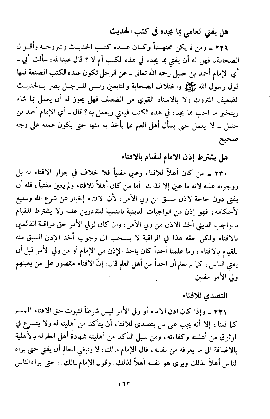 229- ومن لم يكن مجتهدًا وكان عند كتب الحديث وشروحه وأقوال الصحابة، فهل له أن يفتي بما يجده في هذه الكتب أم لا؟ قال عبد الله: سألت أبي -أي: الإمام أحمد بن حنبل -رحمه الله تعالى- عن الرجل تكمن عنده الكتب المصنّفة، فيها قول الرسول -صلى الله عليه وسلم، واختلاف الصحابة والتابعين، وليس للرجل بصر بالحديث الضعيف المتروك، ولا بالإسناد القوي من الضعيف، فهل يجوز له أن يعمل بما شاء، ويتخيِّر ما أحبَّ مما يجده في الكتب فيفتي ويعمل به؟ قال -أي: الإمام أحمد بن حنبل: لا يعمل حتى يسأل أهل العلم عمَّا يأخذ به منها، حتى يكون علمه على وجه صحيح.