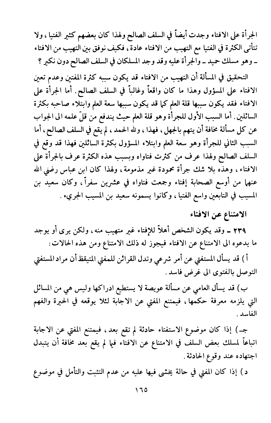 239- وقد يكون الشخص أهلًا للإفتاء غير متهيِّب منه، ولكن يرى أن يوجد ما يدعوه إلى الامتناع عن الإفتاء، فيجوز له ذلك الامتناع، ومن هذه الحالات: