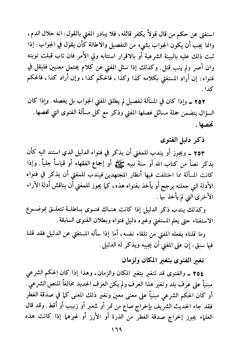 252- وإذا كان في المسألة تفصيل لم يطلق المفتي الجواب بل يفصله، وإذا كان السؤال يتضمَّن جملة مسائل فصلها المفتي وذكر مع كل مسألة الفتوى التي تخصها.