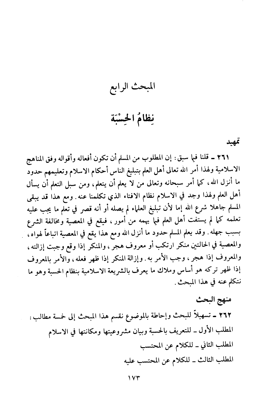 261- قلنا فيما سبق: إنَّ المطلوب من المسلم أن تكون أفعاله وأقواله وفق المناهج الإسلامية، ولهذا أمر الله تعالى أهل العلم بتبليغ الناس أحكام الإسلام، وتعليمهم حدود ما أنزل الله، كما أمر -سبحانه وتعالى- من لا يعلم أن يتعلّم، ومن سُبل التعلُّم أن يسأل أهل العلم، ولهذا وجد في الإسلام نظام الإفتاء الذي تكملنا عنه. ومع هذا قد يبقى المسلم جاهلًا شرع الله، إمَّا لأنَّ تبليغ العلماء لم يصله، أو أنَّه قصَّر في تعلُّم ما يجب عليه تعلُّمه، كما لم يستفت أهل العلم فيما يهمه من أمور فيقع في المعصية ومخالفة الشرع بسبب جهله، وقد يعلم المسلم حدود ما أنزل الله، ومع هذا يقع في المعصية اتباعًا لهواه، والمعصية في الحالتين منكر ارتُكِبَ أو معروف هجر، والمنكر إذا وقع وجبت إزالته، والمعروف إذا هجر وجب الأمر به، وإزالة المنكر إذا ظهر فعله، والأمر بالمعروف إذا ظهر تركه هو أساس وملاك ما يعرف بالشريعة الإسلامية بنظام الحسبة، وهو ما نتكلم عنه في هذا المبحث.
