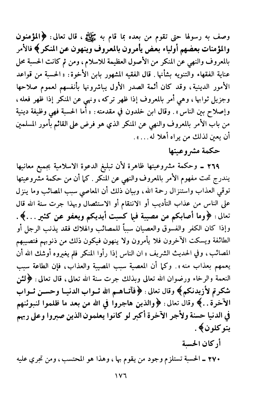 وصف به رسولها حتى تقوم من بعده بما قام به -صلى الله عليه وسلم، قال تعالى: {الْمُؤْمِنُونَ وَالْمُؤْمِنَاتُ بَعْضُهُمْ أَوْلِيَاءُ بَعْضٍ يَأْمُرُونَ بِالْمَعْرُوفِ وَيَنْهَوْنَ عَنِ الْمُنْكَرِ} ، فالأمر بالمعروف والنهي عن المنكر من الأصول العظيمة للإسلام، ومن ثَمَّ كانت الحِسْبَة محل عناية الفقهاء والتنويه بشأنها. قال الفقيه المشهور بابن الأخوة: "الحسبة من قواعد الأمور الدينية، وقد كان أئمة الصدر الأول يباشرونها بأنفسهم؛ لعموم صلاحها وجزيل ثوابها، وهي أمر بالمعروف إذا ظهر تركه، ونهي عن المنكر إذا ظهر فعله، وإصلاح بين الناس"، وقال ابن خلدون في مقدمته: "أمَّا الحسبة فهي وظيفة دينية من باب الأمر بالمعروف والنهي عن المنكر، الذي هو فرض على القائم بأمور المسلمين أن يعيِّن لذلك من يراه أهلًا له".