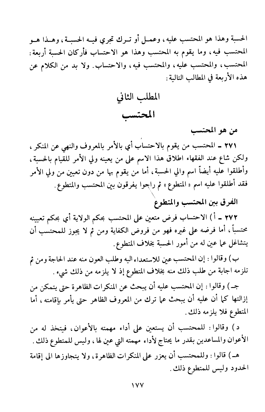 272- أ- الاحتساب فرض متعين على المحتسب بحكم الولاية، أي: بحكم تعيينه محتسبًا، أمَّا فرضه على غيره فهو من فروض الكفاية، ومن ثَمَّ لا يجوز للمحتسب أن يتشاغل عمَّا عُيِّنَ له من أمور الحسبة بخلاف المتطوع.
