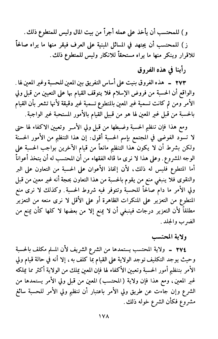 273- هذه الفروق بُنِيَت على أساس التفريق بين المعيَّن للحسبة وغير المعيَّن لها.