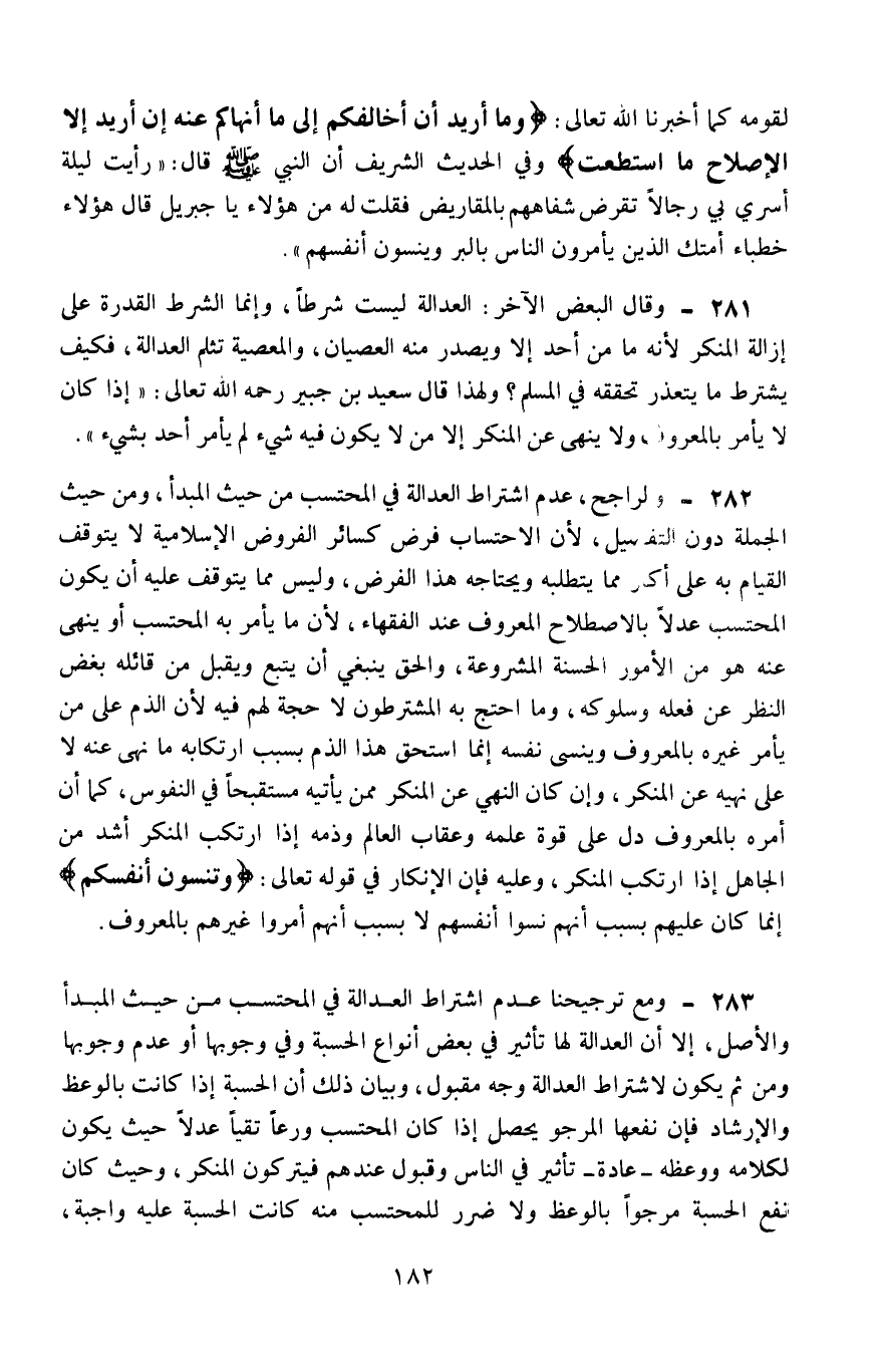 283- ومع ترجيحنا عدم اشتراط العدالة في المحتسب من حيث المبدأ والأصل، إلّا أنَّ العدالة لها تأثير في بعض أنواع الحسبة وفي وجوبها أو عدم وجوبها، ومن ثَمَّ يكون لاشتراط العدالة وجه مقبول، وبيان ذلك أنَّ الحسبة إذا كانت بالوعظ والإرشاد فإنَّ نفعها المرجوّ يحصل إذا كان المحتسب ورعًا تقيًّا عدلًا؛ حيث يكون لكلامه ووعظه -عادة- تأثير في الناس وقبول عندهم، فيتركون المنكر؛ وحيث كان نفع الحسبة مرجوًا بالوعظ ولا ضرر للمحتسب منه كانت الحسبة عليه واجبة،