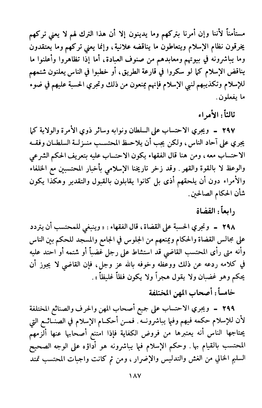 297- ويجري الاحتساب على السلطان ونوابه وسائر ذوي الإمرة والولاية، كما يجري على آحاد الناس، ولكن يجب أن يلاحظ المحتسب منزلة السلطان وفِقْهِ الاحتساب معه، ومن هنا قال الفقهاء: يكون الاحتساب عليه بتعريف الحكم الشرعي والوعظ لا بالقوة والقهر، وقد زخر تاريخنا الإسلامي بأخبار المحتسبين مع الخلفاء والأمراء دون أن يلحقهم أذى، بل كانوا يقابلون بالقبول والتقدير، وهكذا يكون شأن الحكام الصالحين.
