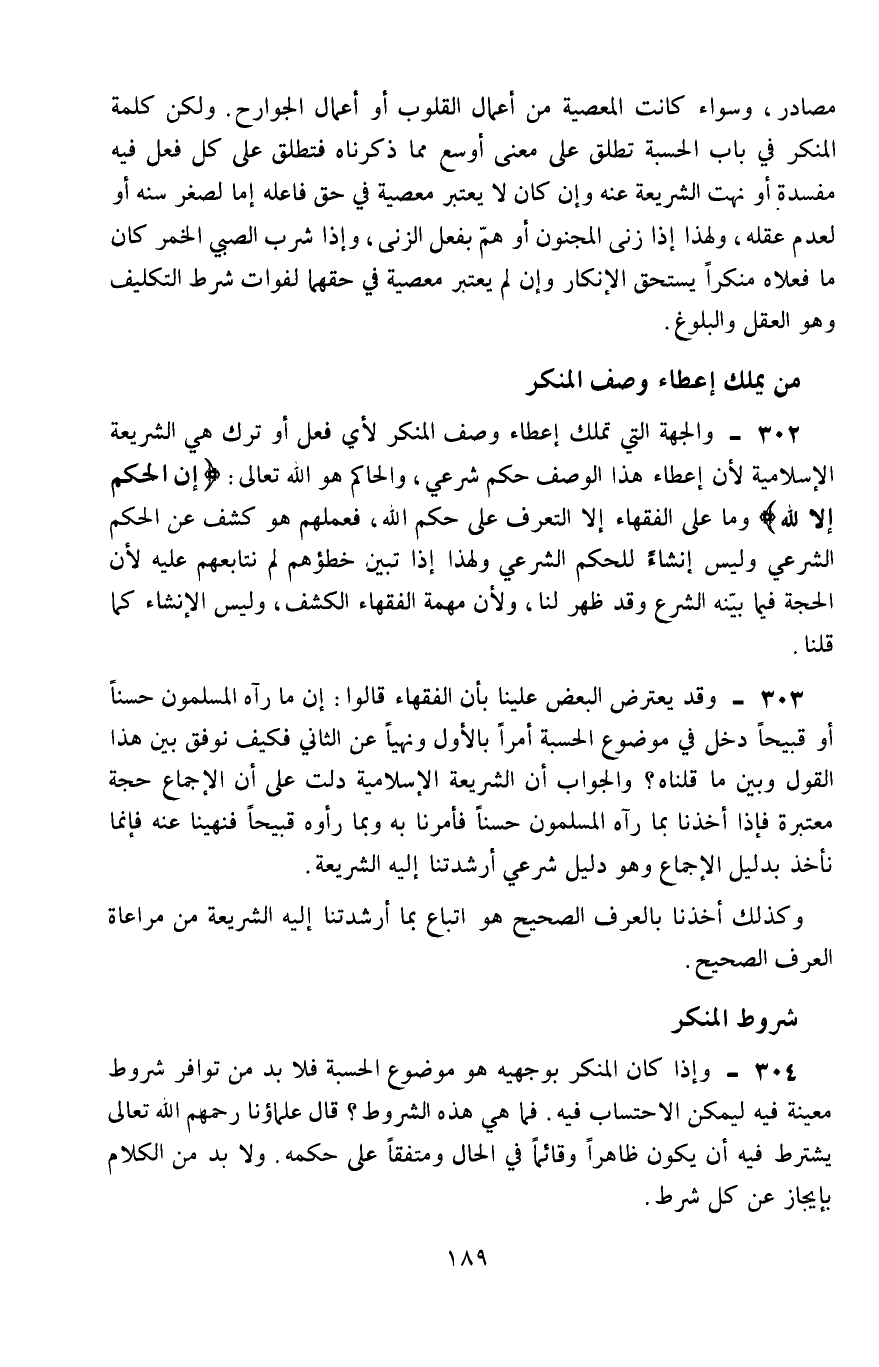 303- وقد يعترض البعض علينا بأنَّ الفقهاء قالوا: إن ما رآه المسلمون حسنًا أو قيبحًا دخل في موضوع الحسبة، أمرًا بالأول ونهيًا عن الثاني، فكيف نوفِّق بين هذا القول وبين ما قلناه؟ والجواب: إنَّ الشريعة الإسلامية دلَّت على أنَّ الإجماع حجة معتبرة، فإذا أخذنا بما رآه المسلمون حسنًا فأمرنا به وبما رأوه قبيحًا فنهينا عنه، فإنما نأخذ بدليل الإجماع، وهو دليل شرعي أرشدتنا إليه الشريعة.