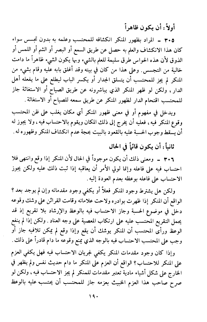306- ومعنى ذلك أن يكون موجودًا في الحال؛ لأنَّ المنكر إذا وقع وانتهى فلا احتساب فيه على فاعله، وإنما لولي الأمر أن يعاقبه إذا ثبت ذلك عليه، ولكن يجوز الاحتساب على فاعله بوعظه بعدم العودة إليه.