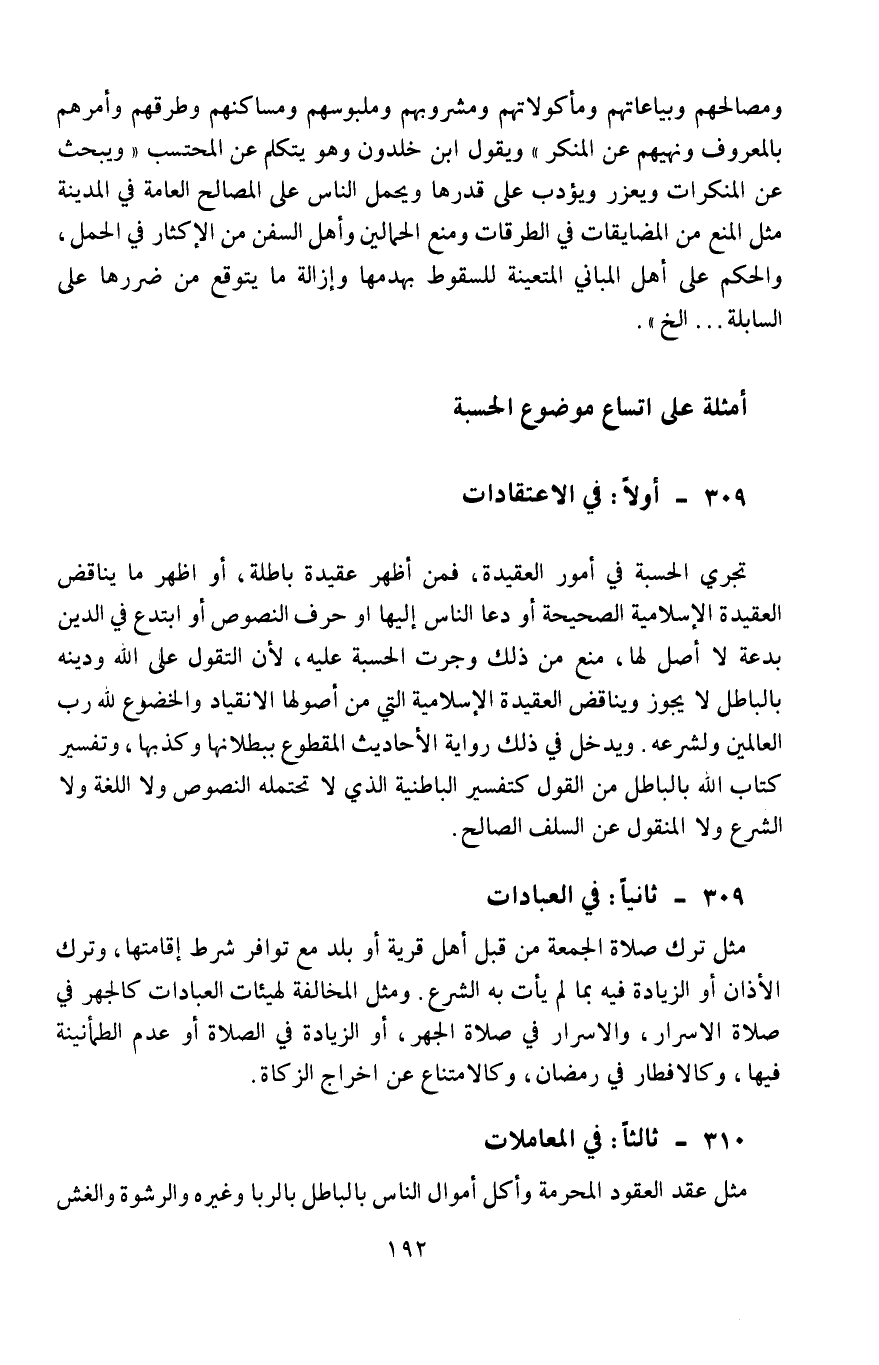 ومصالهم، وبياعاتهم ومأكولاتهم ومشروبهم وملبوسهم ومساكنهم وطرقهم، وأمرهم بالمعروف ونهيهم عن المنكر"، ويقول ابن خلدون وهو يتكلم عن المحتسب: "ويبحث عن المنكرات ويعزِّر ويؤدِّب إلى قدرها، ويحمل الناس على المصالح العامة في المدينة، مثل المنع من المضايقات في الطرقات، ومنع الحمَّالين وأهل السفن من الإكثار في الحمل، والحكم على أهل المباني المتعينة للسقوط بهدمها، وإزالة ما يتوقع من ضررها على السابلة ... إلخ".