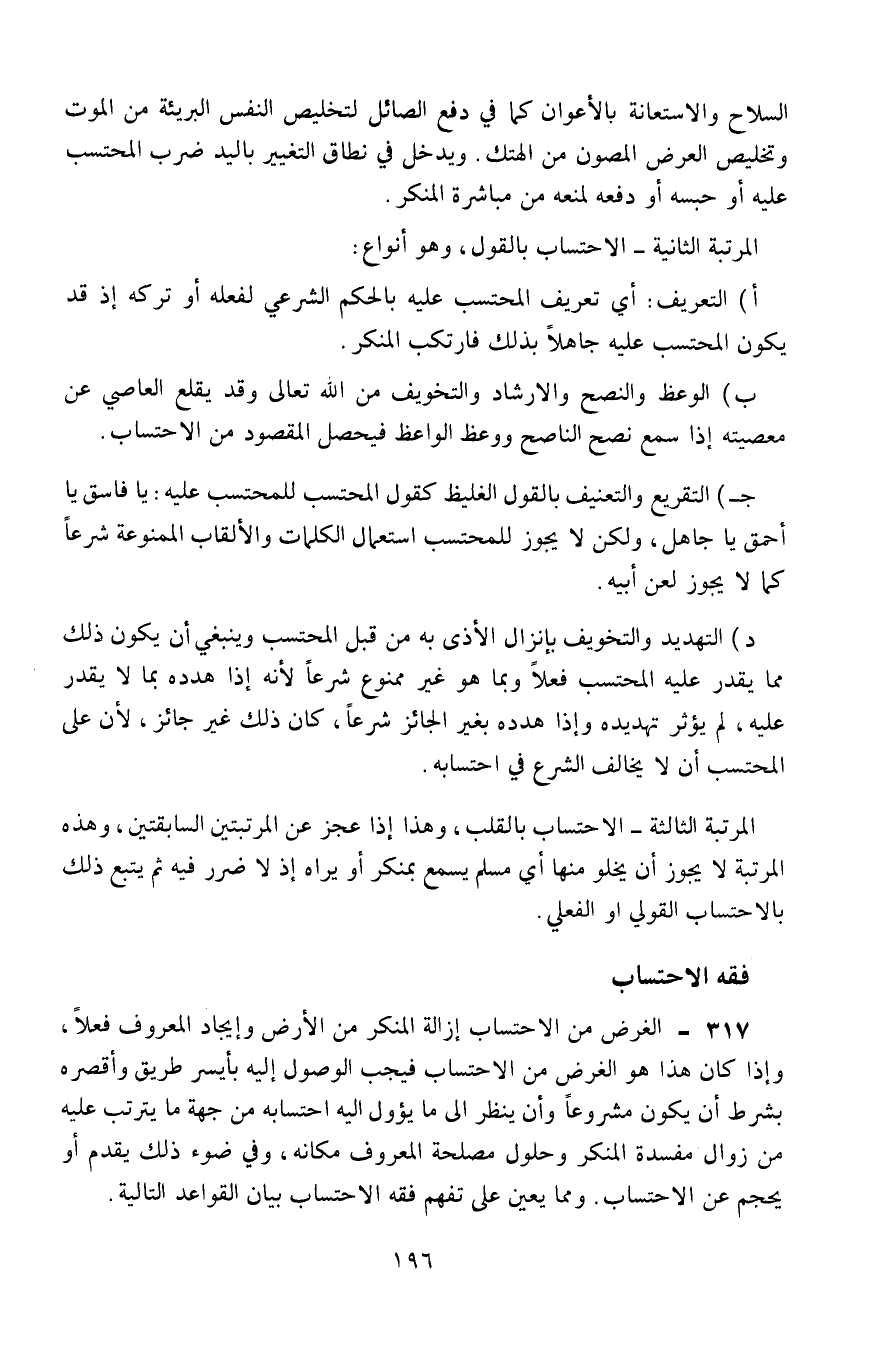 317- الغرض من الاحتساب إزالة المنكر من الأرض وإيجاد المعروف فعلًا، وإذا كان هذا الغرض من الاحتساب فيجب الوصول إليه بأيسر طرق وأقصره، بشرط أن يكون مشروعًا، وأن ينظر إلى ما يئول إليه احتسابه من جهة ما يترتَّب عليه من زوال مفسدة المنكر وحلول مصلحة المعروف مكانه، وفي ضوء ذلك يقدم أو يحجم عن الاحتساب، وما يعين على تفهم فقه الاحتساب بيان القواعد التالية: