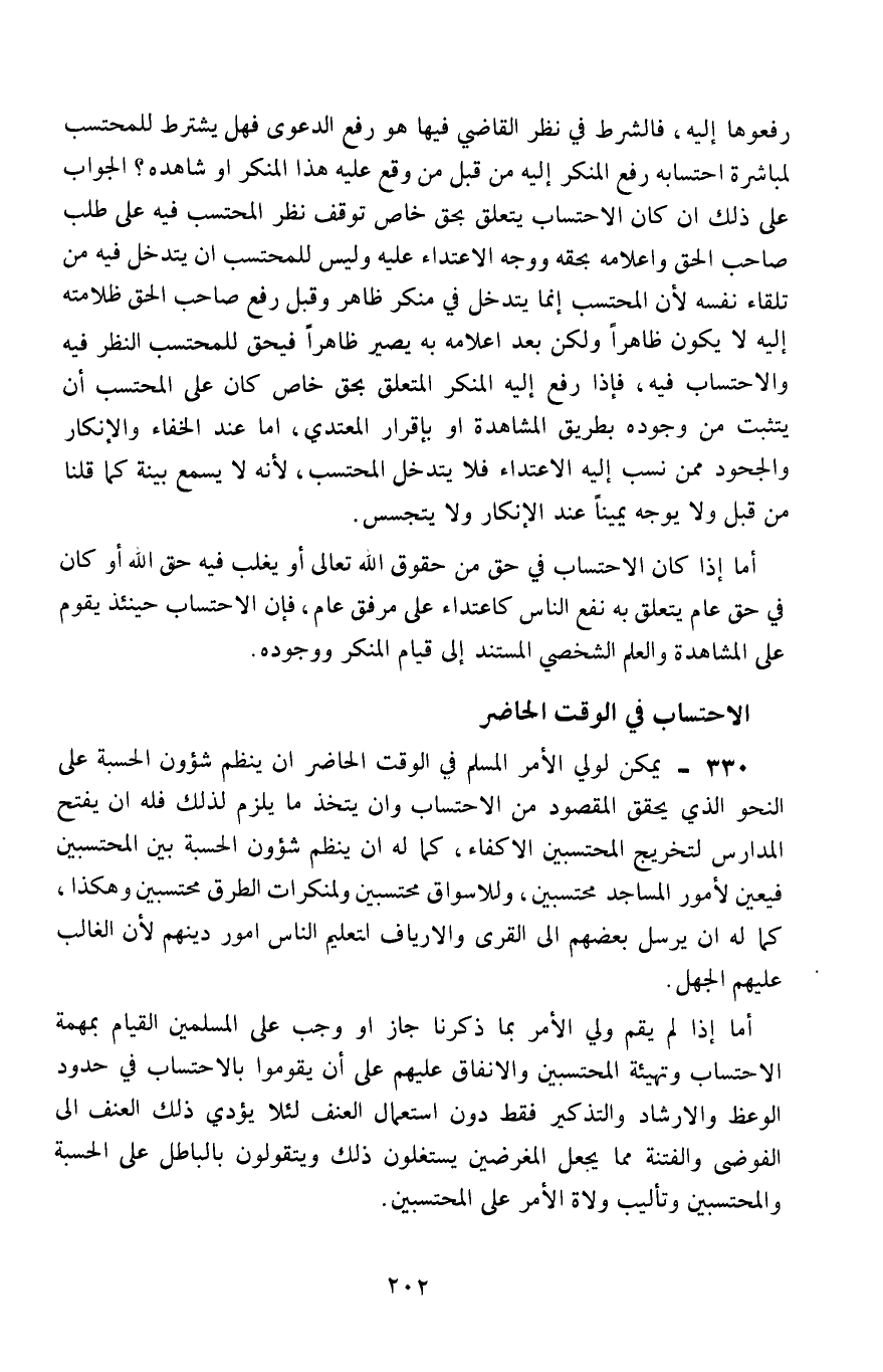 330- يمكن لولي الأمر المسلم في الوقت الحاضر أن ينظم شئون الحسبة على النحو الذي يتحقق المقصود من الاحتساب، وأن يتخذ ما يلزم لذلك، فله أن يفتح المدارس لتخريج المحتسبين الأكفاء، كما له أن ينظم شئون الحسبة بين المحتسبين، فيعيِّن لأمور المساجد محتسبين، وللأسواق محتسبين، ولمنكرات الطرق محتسبين، وهكذا، كما له أن يرسل بعضهم إلى القرى والأرياف لتعليم الناس أمور دينهم؛ لأن الغالب عليهم الجهل.
