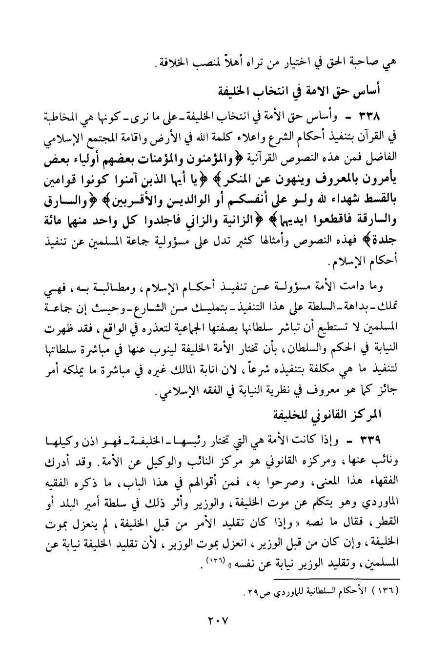 338- وأساس حق الأمة في انتخاب الخليفة -على ما نرى- كونها هي المخاطبة في القرآن بتنفيذ أحكام الشرع وإعلاء كلمة الله في الأرض، وإقامة المجتمع الإسلامي الفاضل، فمن هذه النصوص القرآنية: {وَالْمُؤْمِنُونَ وَالْمُؤْمِنَاتُ بَعْضُهُمْ أَوْلِيَاءُ بَعْضٍ يَأْمُرُونَ بِالْمَعْرُوفِ وَيَنْهَوْنَ عَنِ الْمُنْكَرِ} ، {يَا أَيُّهَا الَّذِينَ آمَنُوا كُونُوا قَوَّامِينَ بِالْقِسْطِ شُهَدَاءَ لِلَّهِ وَلَوْ عَلَى أَنْفُسِكُمْ أَوِ الْوَالِدَيْنِ وَالْأَقْرَبِينَ} ، {وَالسَّارِقُ وَالسَّارِقَةُ فَاقْطَعُوا أَيْدِيَهُمَا} ، {الزَّانِيَةُ وَالزَّانِي فَاجْلِدُوا كُلَّ وَاحِدٍ مِنْهُمَا مِئَةَ جَلْدَةٍ} ، فهذه النصوص وأمثاله كثيرة تدل على مسئولية جماعة المسلمين عن تنفيذ أحكام الإسلام.