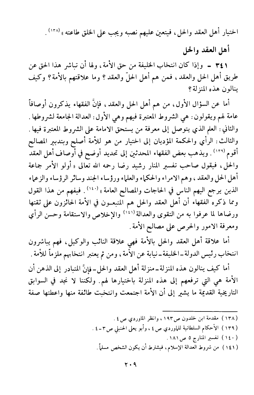341- وإذا كان انتخاب الخليفة من حق الأمة، ولها أن تباشر هذا الحق عن طريق أهل الحلِّ والعقد، فمن هم أهل الحل والعقد؟ وما علاقتهم بالأمة؟ وكيف ينالون هذه المنزلة؟