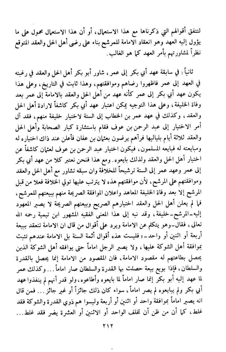 ثانيًا: في سابقة عند أبي بكر إلى عمر، شاور أبو بكر أهل الحل والعقد في رغبته في العهد إلى عمر، فاظهروا رضاهم وموافقتهم، وهذا ثابت في التاريخ، وعلى هذا يكون عهد أبي بكر إلى عمر كأنَّه عهدٌ من أهل الحل والعقد بالإمامة إلى عمر بعد وفاة الخليفة، وعلى هذا التوجيه يمكن اعتبار عهد أبي بكر كاشفًا لإرادة أهل الحلّ والعقد، وكذلك في عهد عمر بن الخطاب إلى الستة لاختيار خليفة منهم، فقد آل أمر الاختيار إلى عبد الرحمن بن عوف، فقام باستشارة كبارة الصحابة وأهل الحل والعقد ثلاثة أيام بلياليهم، فرآهم يرضون بعثمان ابن عفان، فأعلن عند ذاك اختياره له، ومبايعته له، فبايعه المسلمون، فيكون اختيار عبد الرحمن بن عوف لعثمان كاشفًا عن اختيار أهل الحل والعقد، ولذلك بايعوه، ومع هذا فنحن نعتبر كلًّا من عهد أبي بكر إلى عمر، وعهد عمر إلى الستة ترشيحًا للخلافة، وإن سبقه تشاور مع أهل الحل والعقد وموافقتهم على المرشَّح؛ لأن موافقتهم هذه لا يترتَّب عليها تولي الخلافة فعلًا من قِبَل المرشح إلّا بعد وفاة الخليفة المعاهد، وإعلان الموافقة الصريحة منهم ببيعتهم للمرشح، فما لم يعلن أهل الحل والعقد اختيارهم الصريح وبيعتهم الصريحة منهم ببيعتهم للمرشح، لا يصير المعهود إليه -المرشح- خليفة، وقد نبَّه إلى هذا المعنى الفقيه المشهور ابن تيمية -رحمه الله تعالى- فقال -وهو يتكلم عن الإمامة ويرد على أقوال من قال أنَّ الأمامة تنعقد ببيعة أربعة أو اثنين أو واحد: "فليست هذه أقوال أئمة السنة، بل الإمامة عندهم تثبت بموافقة أهل الشوكة عليها، ولا يصير الرجل إمامًا حتى يوافقه أهل الشرك الذي يحصل بطاعتهم له مقصود الإمامة، فإنَّ المقصود من الإمامة إنما يحصل بالقدرة والسلطان، فإذا بويع بيعة حصلت بها القدرة والسلطان صار إمامًا، وكذلك عمر لما عهد إليه أبو بكر إنَّما صار إمامًا لمَّا بايعوه وأطاعوه، ولو قدر أنهم لم ينفِّذوا عهد أبي بكر ولم يبايعوه لم يصر إمامًا، سواء كان ذلك جائزًا، أو غير جائز، فمن قال: إنه يصير إمامًا بموافقة واحد أو اثنين أو أربعة، وليسوا هم ذوي القدرة والشوكة فقد غلط، كما أنَّ من ظنَّ أن تخلف الواحد أو الاثنين أو العشرة يضر، فقد غلط.