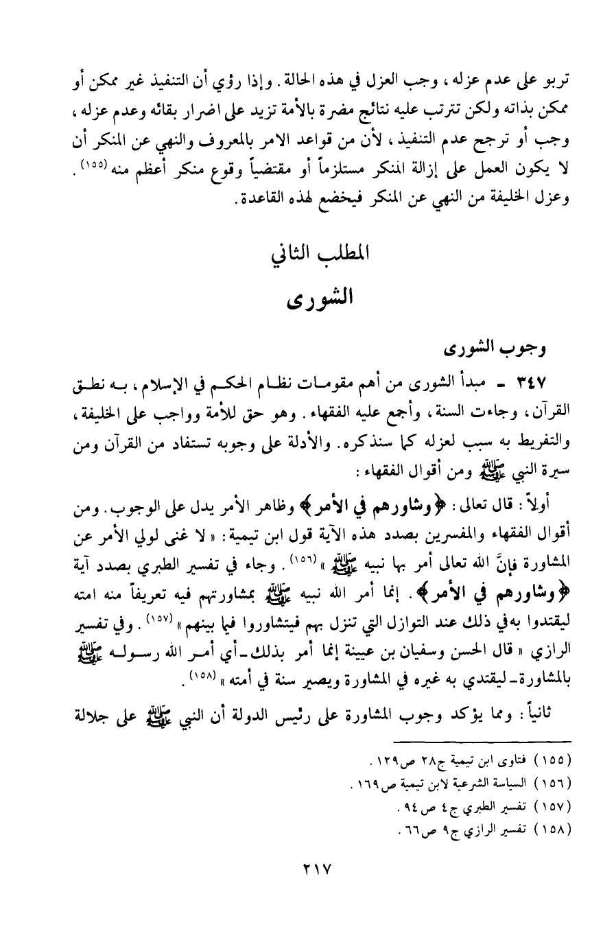 347- مبدأ الشورى من أهمِّ مقومات نظام الحكم في الإسلام، به نطق القرآن، وجاءت السنة، وأجمع عليه الفقهاء، وهو حق للأمة وواجب على الخليفة، والتفريط به سبب لعزله كما سنذكره. والأدلة على وجوبه تستفاد من القرآن ومن سيرة النبي -صلى الله عليه وسلم، ومن أقوال الفقهاء: