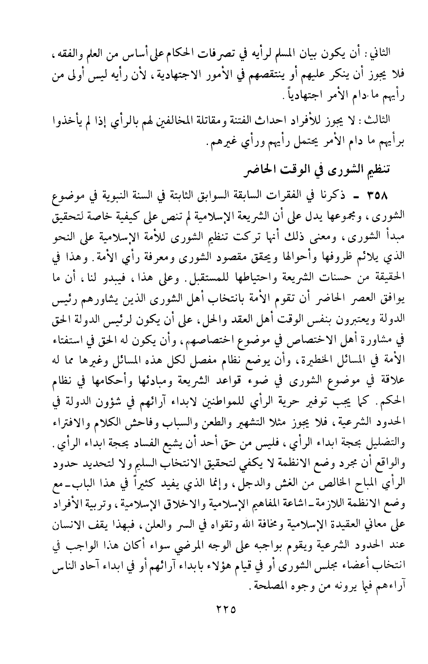 358- ذكرنا في الفقرات السابقة السوابق الثابتة في السنَّة النبوية في موضوع الشورى، ومجموعها يدل على أن الشريعة الإسلامية لم تنصّ على كيفية خاصَّة لتحقيق مبدأ الشورى، ومعنى ذلك أنَّها تركت تنظيم الشورى للأمة الإسلامية على النَّحو الذي يلائم ظروفها وأحوالها، ويحقق مقصود الشورى ومعرفة رأي الأمة، وهذا في الحقيقة من حسنات الشريعة واحتياطها للمستقبل، وعلى هذا فيبدو لنا أنَّ ما يوافق العصر الحاضر أن تقوم الأمة بانتخاب أهل الشورى الذين يشاورهم رئيس الدولة، ويعتبرون بنفس الوقت أهل العقد والحل، على أن يكون لرئيس الدولة الحقّ في مشاورة أهل الاختصاص في موضوع اختصاصهم، وأن يكون له الحق في استفتاء الأمَّة في المسائل الخطيرة، وأن يوضع نظام مفصَّل لكل هذه المسائل وغيرها، مما له علاقة في موضوع الشورى في ضوء قواعد الشريعة ومبائدها وأحكامها في نظام الحكم، كما يجب توفير حرية الرأي للمواطنين لإبداء آرائهم في شئون الدولة في الحدود الشرعية، فلا يجوز مثلًا التشهير والطعن والسباب وفاحش الكلام والافتراء والتضليل بحجة إبداء الرأي، فليس من حقِّ أحدٍ أن يشيع الفساد بحجة إبداء الرأي.