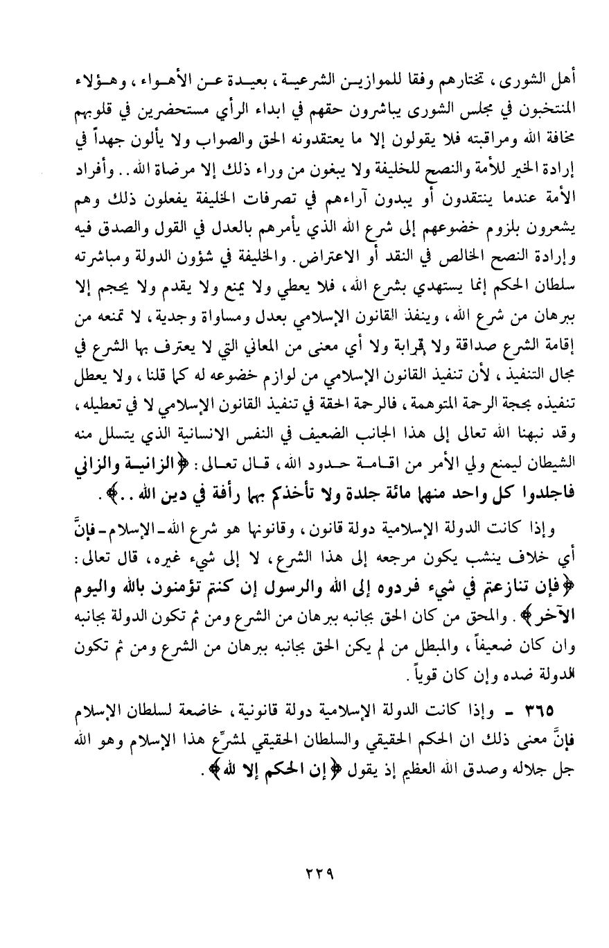 365- وإذا كانت الدولة الإسلامية دولة قانونية خاضعة لسلطان الإسلام، فإن معنى ذلك أنَّ الحكم الحقيقي والسلطان الحقيقي لمشرِّع هذا الإسلام، وهو الله جلَّ جلاله، وصدق الله العظيم إذ يقول: {إِنِ الْحُكْمُ إِلَّا لِلَّهِ} .
