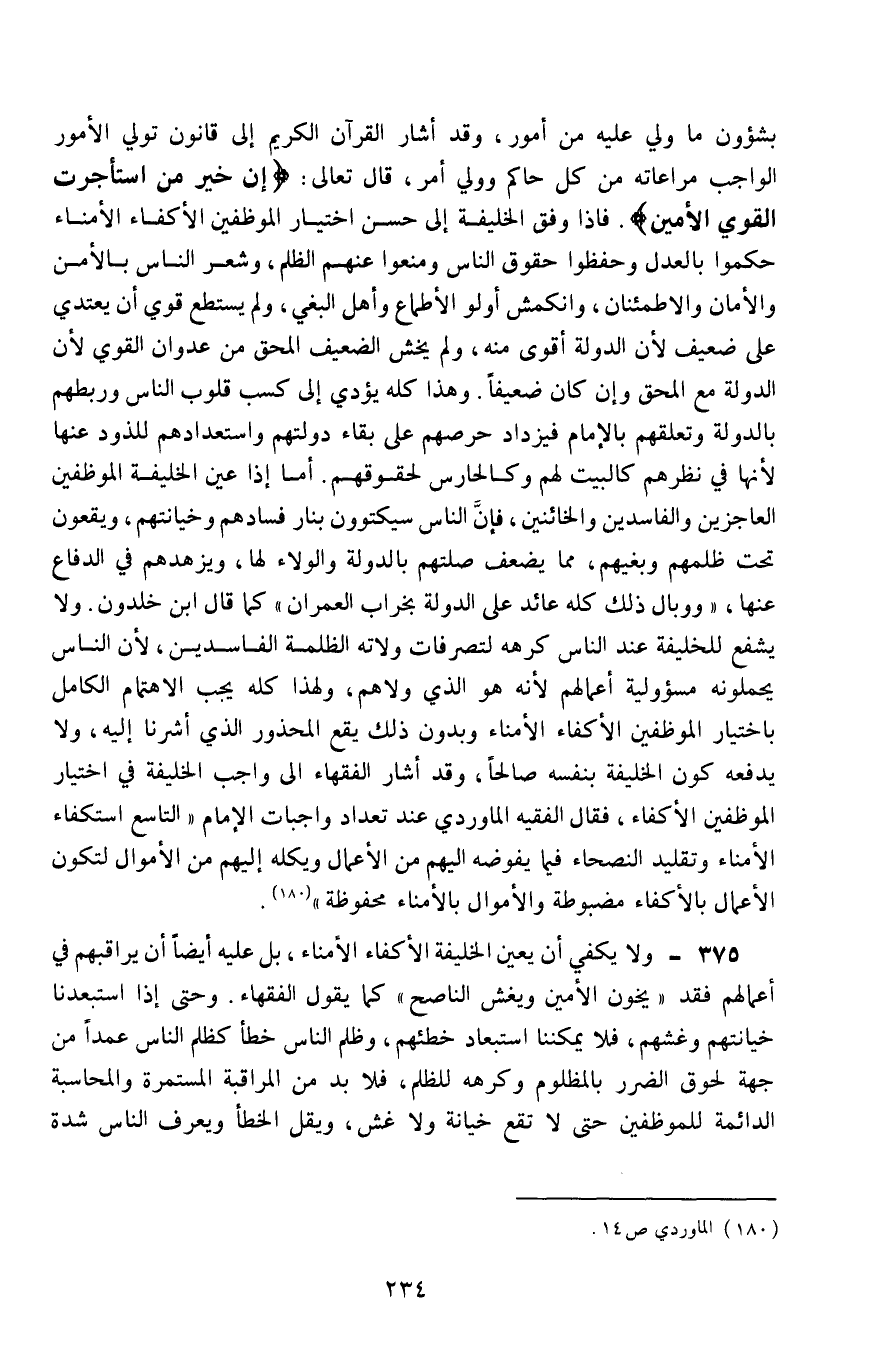375- ولا يكفي أن يعين الخليفة الأكفاء الأمناء، بل عليه أيضًا أن يراقبهم في أعمالهم، فقد "يخون الأمين ويغش الناصح" كما يقول الفقهاء، وحتى إذا استبعدنا خيانتهم وغشهم، فلا يمكننا استبعاد خطئهم، وظلم الناس خطأ كظلم الناس عمدًا من جهة لحوق الضرر بالمظلوم وكرهه للظلم، فلا بُدَّ من المراقبة المستمرة والمحاسبة الدائمة للموظفين، حتى لا تقع خيانة ولا غش، ويقل الخطأ، ويعرف الناس شدة