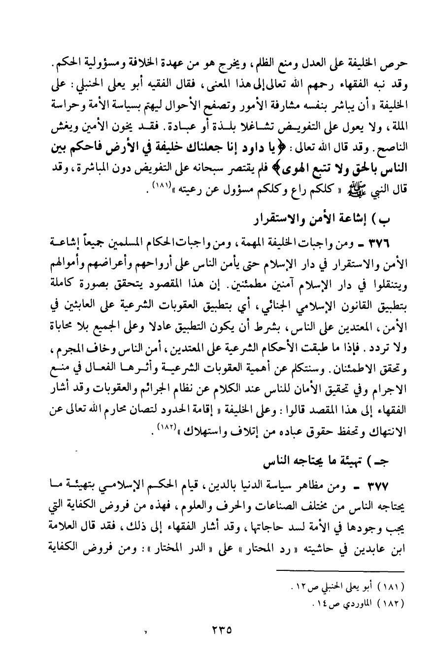 376- ومن واجبات الخليفة المهمة، ومن واجبات الحكام المسلمين جميعًا، إشاعة الأمن والاستقرار في دار الإسلام، حتى يأمن الناس على أرواحهم وأعراضهم وأمولهم، وينتقلوا في دار الإسلام آمنين مطمئنين. إنَّ هذا المقصود يتحقق بصورة كاملة بتطبيق القانون الإسلامي الجنائي، أي: بتطبيق العقوبات الشرعية على العابثين في الأمن، المعتدين على الناس، بشرط أن يكون التطبيق عادلًا وعلى الجميع بلا محاباة ولا تردد، فإذا ما طبِّقت الأحكام الشرعية على المعتدين أمن الناس وخاف المجرم، وتحقق الاطمئنان، وسنتكلم عن أهمية العقوبات الشرعية وأثرها الفعَّال في منع الإجرام، وفي تحقيق الأمان للناس، عند الكلام عن نظام الجرائم والعقوبات، وقد أشار الفقهاء إلى هذا المقصد قالوا: وعلى الخليفة "إقامة الحدود لتُصَان محارم الله تعالى عن الانتهاك، وتحفظ حقوق عباده من إتلاف واستهلاك"2.