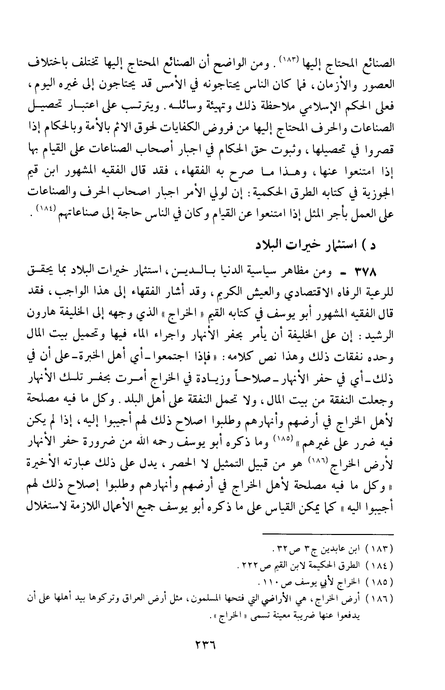 378- ومن مظاهر سياسية الدنيا بالدين، استثمار خيرات البلاد بما يحقق للرعية الرفه الاقتصادي والعيش الكريم، وقد أشار الفقهاء إلى هذا الواجب، فقد قال الفقيه المشهور أبو يوسف في كتابه القيم "الخراج"، الذي وجه إلى الخليفة هارون الرشيد: إن على الخليفة أن يأمر بحفر الأنهار وإجراء الماء فيها، وتحميل بيت المال وحده نفقات ذلك، وهذا نص كلامه: "فإذا اجتمعوا -أي: أهل الخبرة- على أنَّ في ذلك -أي: في حفر الأنهار- صلاحًا وزيادة في الخراج، أمرت بحفر تلك الأنهار، وجعلت النفقة من بيت المال، ولا تحمل النفقة على أهل البلد، ولك ما فيه مصلحة لأهل الخراج في أرضهم وأنهارهم، وطلبوا إصلاح ذلك لهم، أجيبوا إليه إذا لم يكن فيه ضرر على غيرهم"2 وما ذكره أبو يوسف -رحمه الله- من ضرورة حفر الأنهار لأرض الخراج3 هو من قبيل التمثيل لا الحصر، يدل على ذلك عبارته الأخيرة: "وكل ما فيه مصلحة لأهل الخراج في أرضهم وأنهارهم، وطلبوا إصلاح ذلك لهم، أجيبوا إليه" كما يمكن القياس على ما ذكره أبو يوسف جميع الأعمال اللازمة لاستغلال