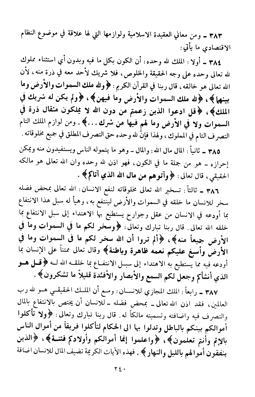 383- ومن معاني العقيدة الإسلامية ولوازمها التي لها علاقة في موضوع النظام الاقتصادي ما يأتي: