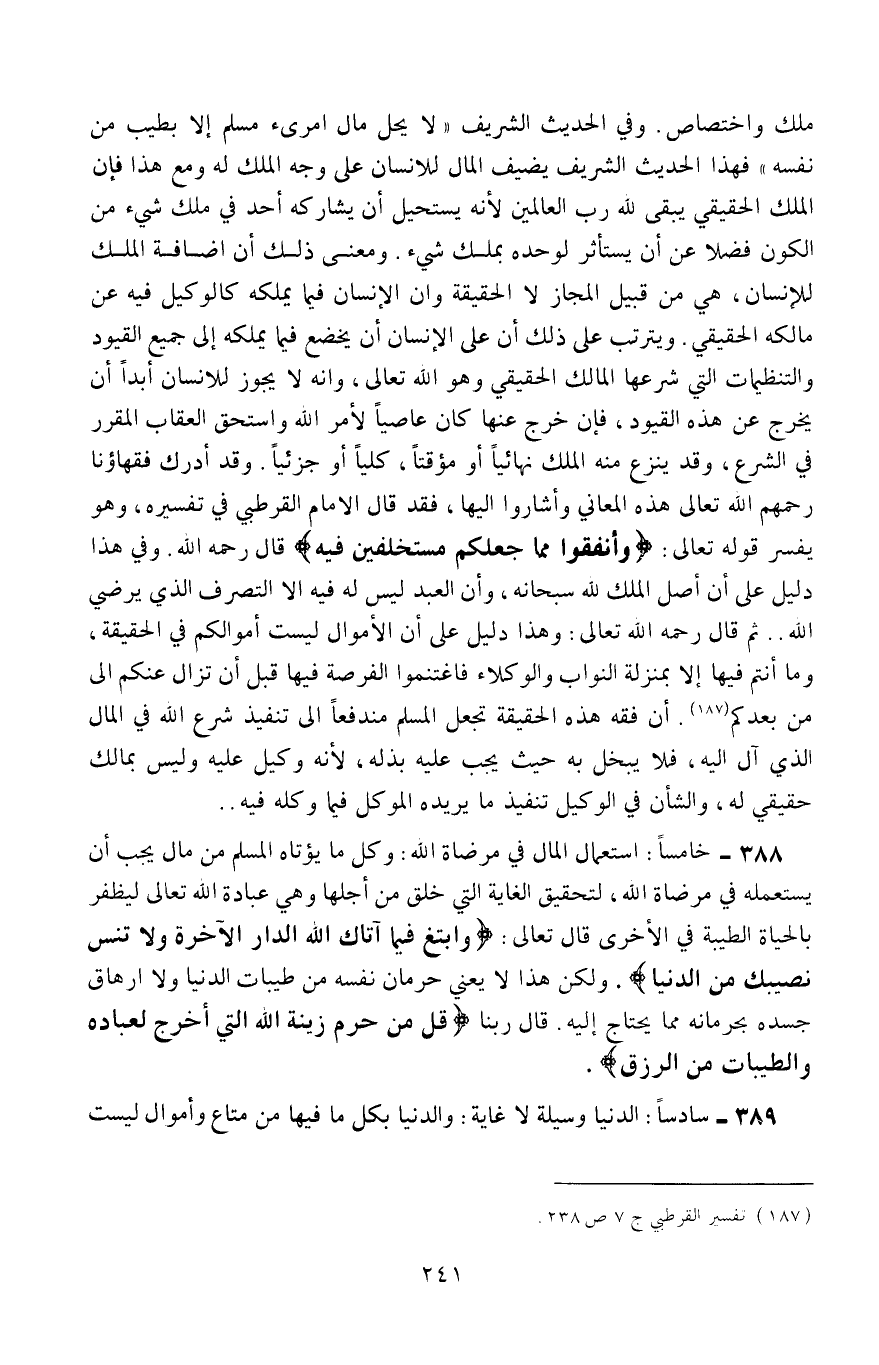 ملك واختصاص، وفي الحديث الشريف: "لا يحل مال امرئ مسلم إلّا بطيبٍ من نفسه"، فهذا الحديث الشريف يضيف المال للإنسان على وجه الملك له، ومع هذا فإنَّ الملك الحقيقي يبقى لله رب العالمين؛ لأنه يستحيل أن يشاركه أحد في ملك شيء. ومعنى ذلك أنَّ إضافة الملك للإنسان هي من قبيل المجاز لا الحقيقة، وأن الإنسان فيما يملكه كالوكيل فيه عن مالكه الحقيقي، ويترتب على ذلك أن على الإنسان أن يخضع إلى جميع القيود والتنظيمات التي شرعها المالك الحقيقي وهو الله تعالى، وأنه لا يجوز للإنسان أبدًا أن يخرج عن هذه القيود، فإن خرج عنها كان عاصيًا لأمر الله، واستحق العقاب المقرَّر في الشرع، وقد ينزع منه الملك نهائيًّا أو مؤقتًا، كليًا أو جزئيًّا، وقد أدرك فقهاؤنا -رحمهم الله تعالى- هذه المعاني وأشاروا إليها، فقد قال الإمام القرطبي في تفسيره، وهو يفسِّر قوله تعالى: {وَأَنْفِقُوا مِمَّا جَعَلَكُمْ مُسْتَخْلَفِينَ فِيهِ} قال -رحمه الله: وفي هذا دليل على أن أصل الملك لله سبحانه، وأنَّ العبد ليس له فيه إلّا التصرف الذي يرضي الله. ثم قال -رحمه الله تعالى: وهذا دليل على أن الأموال ليست أموالكم في الحقيقة، وما أنتم فيها إلّا بمنزلة النوَّاب والوكلاء، فاغتنموا الفرصة فيها قبل أن تزال عنكم إلى من بعدكم1. إنَّ فقه هذه الحقيقة تجعل المسلم مندفعًا إلى تنفيذ شرع الله في المال الذي آل إليه، فلا يبخل به حيث يجب عليه بذله؛ لأنه وكيل عليه وليس بمالك حقيقي له، والشأن في الوكيل تنفيذ ما يريده الموكّل فيما وكله فيه.