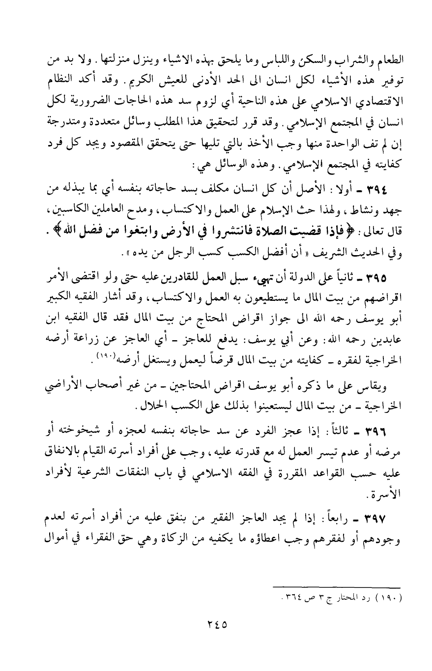 394- أولًا: الأصل أن كل إنسان مكلَّف بسد حاجاته بنفسه، أي: بما يبذله من جهد ونشاط، ولهذا حثَّ الإسلام على العمل والاكتساب، ومدح العاملين الكاسبين، وقال تعالى: {فَإِذَا قُضِيَتِ الصَّلَاةُ فَانْتَشِرُوا فِي الْأَرْضِ وَابْتَغُوا مِنْ فَضْلِ اللَّهِ} ، وفي الحديث الشريف: "إنَّ أفضل الكسب كسب الرجل من يده".