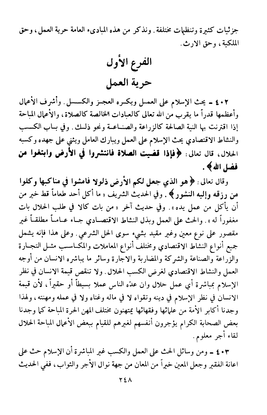 وقال تعالى: {هُوَ الَّذِي جَعَلَ لَكُمُ الْأَرْضَ ذَلُولًا فَامْشُوا فِي مَنَاكِبِهَا وَكُلُوا مِنْ رِزْقِهِ وَإِلَيْهِ النُّشُورُ} ، وفي الحديث الشريف: "ما أكل أحد طعامًا قط خير من أن يأكل من عمل يده"، وفي حديث آخر: "من بات كالًّا في طلب الحلال بات مغفورًا له"، والحث على العمل وبذل النشاط الاقتصادي جاء عامًّا مطلقًا غير مقصور على نوع معين، وغير مقيد بشيء سوى الحِلّ الشرعي، وعلى هذا فإنَّه يشمل جميع أنواع النشاط الاقتصادي، ومختلف أنواع المعاملات والمكاسب، مثل: التجارة والزراعة والصناعة والشركة والمضاربة والإجارة، وسائر ما يباشره الإنسان من أوجه العمل والنشاط الاقتصادي لغرض الكسب الحلال، ولا تنقص قيمة الإنسان في نظر الإسلام بمباشرة أيِّ عمل حلال وإن عده الناس عملًا بسيطًا أو حقيرًا؛ لأنَّ قيمة الإنسان في نظر الإسلام في دينه وتقواه، لا في ماله وغناه، ولا في عمله ومهنته، ولهذا وجدنا أكابر الأمَّة من علمائها وفقهائها يمتهنون مختلف المهن الحرة المباحة، كما وجدنا بعض الصحابة الكرام يؤجرون أنفسهم لغيرهم؛ للقيام ببعض الأعمال المباحة الحلال لقاء أجر معلوم.