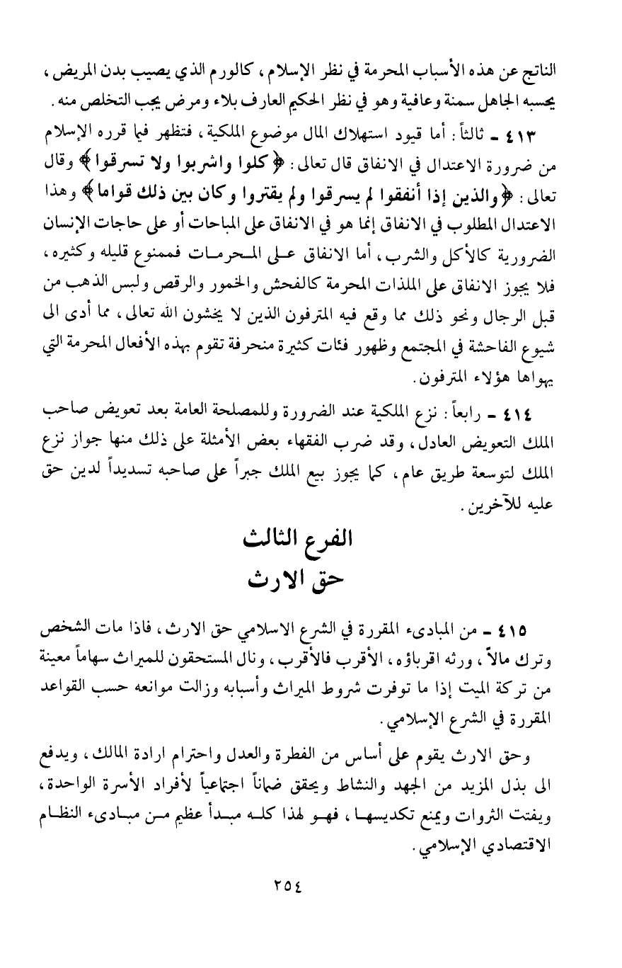 413- ثالثًا: أمَّا قيود استهلاك المال موضوع الملكية، فتظهر فيما قرَّره الإسلام من ضرورة الاعتدال في الإنفاق، قال تعالى: {كُلُوا وَاشْرَبُوا وَلَا تُسْرِفُوا} ، وقال تعالى: {وَالَّذِينَ إِذَا أَنْفَقُوا لَمْ يُسْرِفُوا وَلَمْ يَقْتُرُوا وَكَانَ بَيْنَ ذَلِكَ قَوَامًا} ، وهذا الاعتدال المطلوب في الإنفاق إنما هو في الإنفاق على المباحات أو على حاجات الإنسان الضرورية كالأكل والشرب، أمَّا الإنفاق على المحرَّمات فممنوع قليله وكثيره، فلا يجوز الإنفاق على الملذات المحرَّمة كالفحش والخمور والرقص ولبس الذهب من قِبَل الرجال، ونحو ذلك مما وقع فيه المترفون الذين لا يخشون الله تعالى، مما أدَّى إلى شيوع الفاحشة في المجتمع، وظهور فئات كثيرة منحرفة تقوم بهذه الأفعال المحرَّمة التي يهواها هؤلاء المترفون.