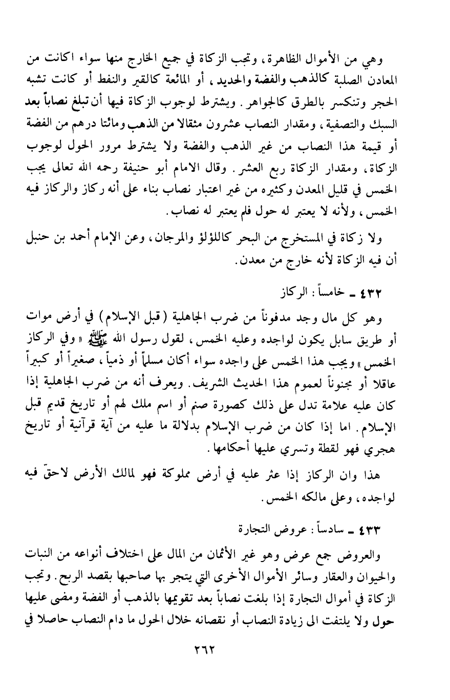 وهي من الأمول الظاهرة، وتجب الزكاة في جميع الخارج منها، سواء أكانت من المعادن الصلبة كالذهب والفضة والحديد، أو المائعة كالقير والنفط، أو كانت تشبه الحجر وتنكسر بالطرق كالجواهر، ويشترط لوجوب الزكاة فيها أن تبلغ نصابًا بعد السبك والتصفية، ومقدار النصاب عشرون مثقالًا من الذهب، ومائتا درهم من الفضة، أو قيمة هذا النصاب من غير الذهب والفضة، ولا يشترط مرور الحول لوجوب لزكاة، ومقدار الزكاة ربع العشر. وقال الإمام أبو حنيفة -رحمه الله تعالى: يجب الخمس في قليل المعدن وكثيره من غير اعتبار نصاب بناءً على أنه ركاز، والركاز فيه الخمس؛ ولأنه لا يعتبر له حول، فلم يعتبر له نصاب.