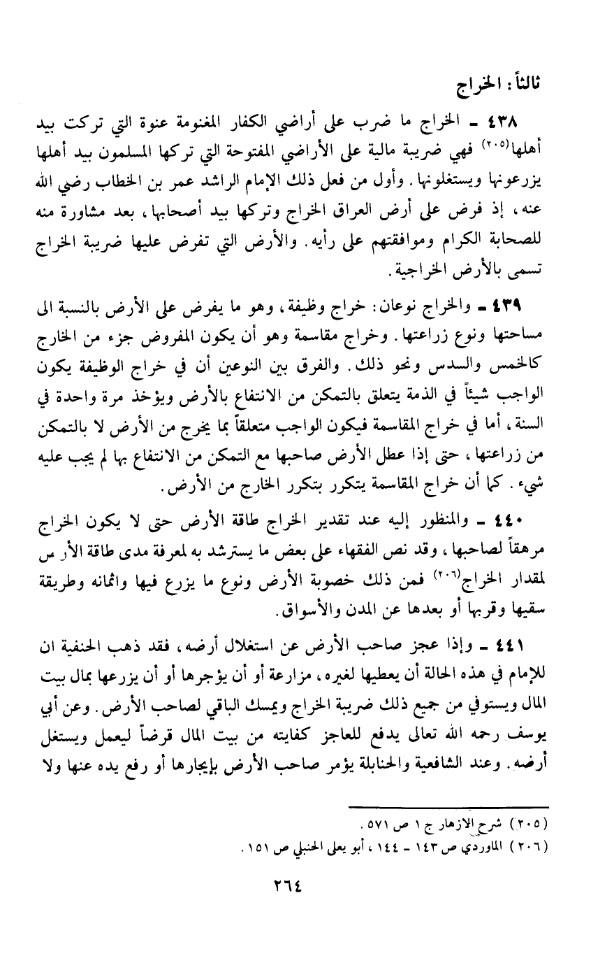 439- والخراج نوعان: خراج وظيفة، وهو ما يفرض على الأرض بالنسبة إلى مساحتها ونوع زراعتها، وخراج مقاسمة وهو أنَّ المفروض جزء من الخارج؛ كالخمس والسدس ونحو ذلك، والفرق بين النوعين أنَّ في خراج الوظيفة يكون الواجب شيئًا في الذمَّة يتعلق بالتمكن من الانتفاع بالأرض، ويؤخذ مرة واحدة في السنة، أمَّا في خراج المقاسمة فيكون الواجب متعلقًا بما يخرح من الأرض لا بالتمكين من زراعتها، حتى إذا عطل الأرض صاحبها مع التمكّن من الانتفاع بها لم يجب عليه شيء، كما أنَّ خراج المقاسمة يتكرَّر بتكرر الخارج من الأرض.