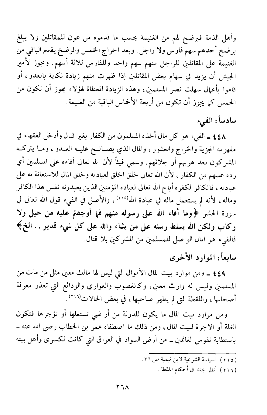 448- الفيء هو كل مال أخذه المسلمون من الكفار بغير قتال وأدخل الفقهاء في مفهومه الجزية والخراج والعشور، والمال لذي يصالح عليه العدو، وما يتركه المشركون بعد هربهم أو جلائهم، وسمِّي فيئًا لأنَّ الله تعالى أفاءه على المسلمين، أي: ردَّه عليهم من الكفار؛ لأنَّ الله تعالى خلق الخلق لعبادته، وخلق المال للاستعانة به على عبادته، فالكافر لكفره أباح الله تعالى لعباده المؤمنين الذين يعبدونه نفس هذا الكافر وماله؛ لأنه لم يستعمل ماله في عبادة الله1، والأصل في الفيء قول الله تعالى في سورة الحشرة: {وَمَا أَفَاءَ اللَّهُ عَلَى رَسُولِهِ مِنْهُمْ فَمَا أَوْجَفْتُمْ عَلَيْهِ مِنْ خَيْلٍ وَلا رِكَابٍ وَلَكِنَّ اللَّهَ يُسَلِّطُ رُسُلَهُ عَلَى مَنْ يَشَاءُ وَاللَّهُ عَلَى كُلِّ شَيْءٍ قَدِيرٌ} ، فالفيء هو المال الواصل للمسلمين من المشركين بلا قتال.