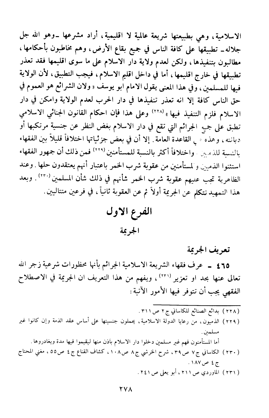 465- عرَّف فقهاء الشريعة الإسلامية الجرائم بأنَّها محظورات شرعية زجر الله تعالى عنها بحَدٍّ أو تعزير3، ويفهم من هذا التعريف أنَّ الجريمة في الاصطلاح الفقهي يجب أن تتوفَّر فيها الأمور الآتية:
