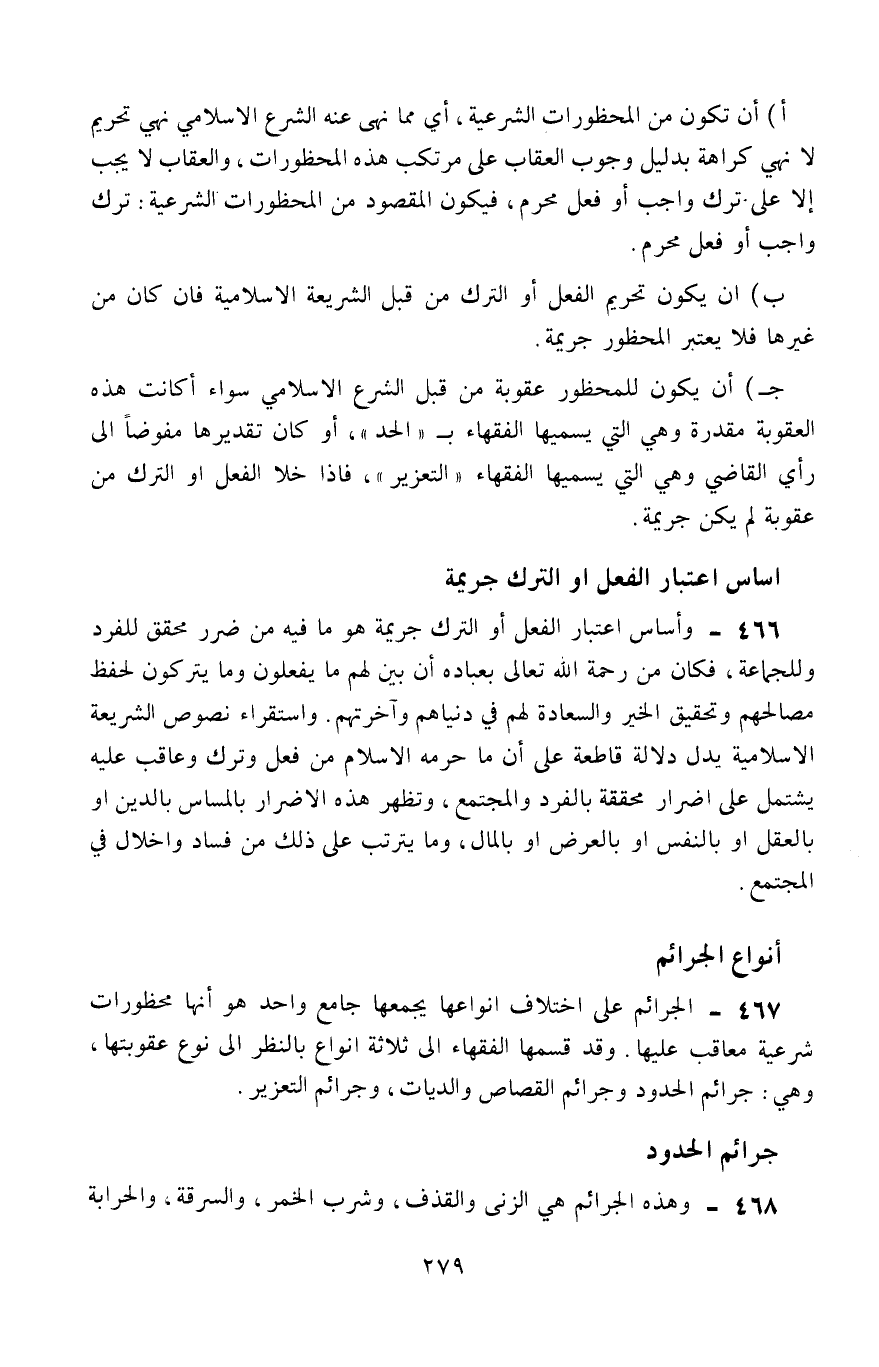 466- وأساس اعتبار الفعل أو الترك جريمة هو ما فيه من ضرر محقَّق للفرد وللجماعة، فكان من رحمة الله تعالى بعباده أن بيِّنَ لهم ما يفعلون وما يتركون لحفظ مصالحهم وتحقيق الخير والسعادة لهم في دنياهم وآخرتهم، واستقراء نصوص الشريعة الإسلامية يدل دلالة قاطعة على أنَّ ما حرَّمه الإسلام من فعلٍ وتركٍ وعاقب عليه، يشتمل على أضرار محقَّقة بالفرد والمجتمع، وتظهر هذه الأضرار بالمساس بالدِّين أو بالعقل أو بالنفس أو بالعرض أو بالمال، وما يترتَّب على ذلك من فسادٍ وإخلال في المجتمع.