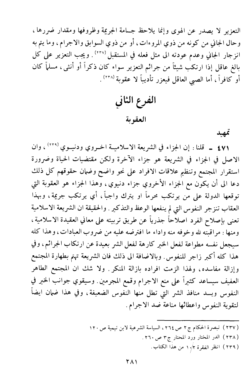 471- قلنا: إن الجزاء في الشريعة الإسلامية أخروي ودنيوي3، وإنَّ الأصل في الجزاء في الشريعة هو جزاء الآخرة، ولكنَّ مقتضيات الحياة وضرورة استقرار المجتمع وتنظيم علاقات الأفراد على نحوٍ واضحٍ، وضمان حقوقهم، كلّ ذلك دعا إلى أن يكون مع الجزاء الأخروي جزاء دنيوي، وهذا الجزاء هو العقوبة التي توقعها الدولة على من يرتكب محرَّمًا أو يترك واجبًا، أي: يرتكب جريمة، وبهذا العقاب تنزجر النفوس التي لم ينفعها الوعظ والتذكير، والحقيقة أنَّ الشريعة الإسلامية تعنى بإصلاح الفرد إصلاحًا جذريًّا عن طريق تربيته على معاني العقيدة الإسلامية، ومنها: مراقبته لله وخوفه منه، وأداء ما افترضه عليه من ضروب العبادات، وهذا كله سيجعل نفسه مطاوعة لفعل الخير، كارهة لفعل الشر، بعيدةً عن ارتكاب الجرائم، وفي هذا كله أكبر زاجر للنفوس، وبالإضافة إلى ذلك فإنَّ الشريعة تهتم بطهارة المجتمع وإزالة مفاسده، ولهذا ألزمت أفراده بإزالة المنكر، ولا شكَّ أن المجتمع الطاهر العفيف سيساعد كثيرًا على منع الإجرام وقمع المجرمين، وسيقوّي جوانب الخير في النفوس، ويسد منافذ الشر التي تطلّ منها النفوس الضعيفة، وفي هذا ضمان أيضًا لتقوية النفوس وإعطائها مناعةً ضد الإجرام.