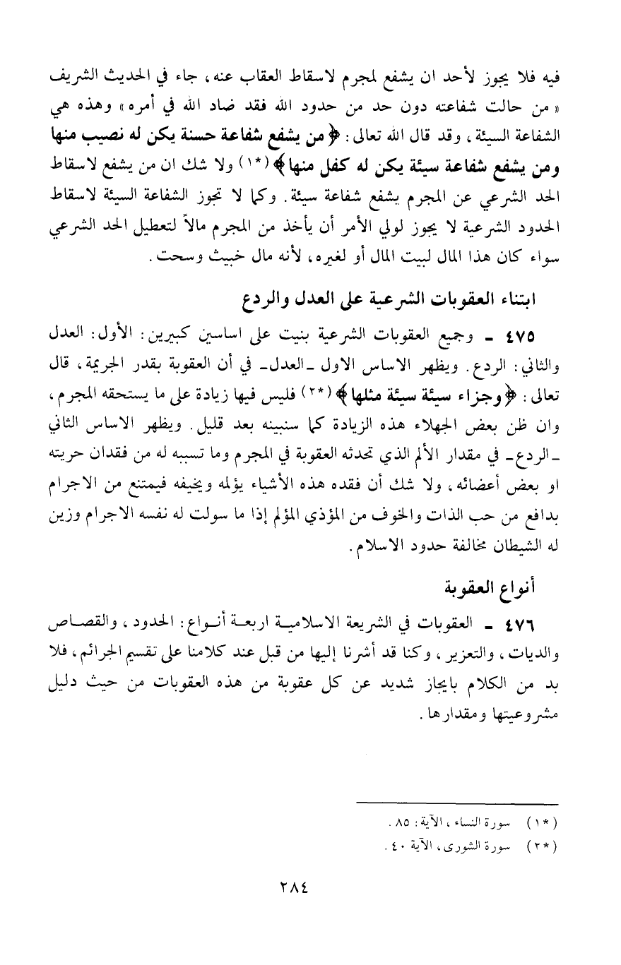 فيه، فلا يجوز لأحد أن يشفع لمجرم لإسقاط العقاب عنه، جاء في الحديث الشريف: "من حالت شفاعته دون حَدٍّ من حدود الله فقد ضادَّ الله في أمره"، وهذه هي الشفاعة السيئة، وقد قال الله تعالى: {مَنْ يَشْفَعْ شَفَاعَةً حَسَنَةً يَكُنْ لَهُ نَصِيبٌ مِنْهَا وَمَنْ يَشْفَعْ شَفَاعَةً سَيِّئَةً يَكُنْ لَهُ كِفْلٌ مِنْهَا} 1، ولا شكَّ أنَّ من يشفع لإسقاط الحدِّ الشرعي عن المجرم يشفع شفاعة سيئة، وكما لا تجوز الشفاعة السيئة لإسقاط الحدود الشرعية، لا يجوز لولي الأمر أن يأخذ من المجرم مالًا لتعطيل الحدِّ الشرعي، سواء كان هذا المال لبيت المال أو لغيره؛ لأنه مال خبيث وسحت.