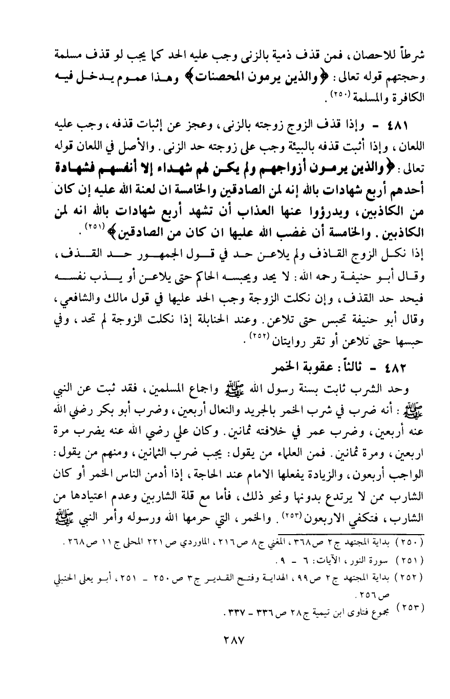 481- وإذا قذف الزوج زوجته بالزنى، وعجز عن إثبات قذفه، وجب عليه اللعان، وإذا أثبت قذفه بالبينة وجب على زوجته حدّ الزنى، والأصل في اللعان قوله تعالى: {وَالَّذِينَ يَرْمُونَ أَزْوَاجَهُمْ وَلَمْ يَكُنْ لَهُمْ شُهَدَاءُ إِلَّا أَنْفُسُهُمْ فَشَهَادَةُ أَحَدِهِمْ أَرْبَعُ شَهَادَاتٍ بِاللَّهِ إِنَّهُ لَمِنَ الصَّادِقِينَ، وَالْخَامِسَةُ أَنَّ لَعْنَتَ اللَّهِ عَلَيْهِ إِنْ كَانَ مِنَ الْكَاذِبِينَ، وَيَدْرَأُ عَنْهَا الْعَذَابَ أَنْ تَشْهَدَ أَرْبَعَ شَهَادَاتٍ بِاللَّهِ إِنَّهُ لَمِنَ الْكَاذِبِينَ، وَالْخَامِسَةَ أَنَّ غَضَبَ اللَّهِ عَلَيْهَا إِنْ كَانَ مِنَ الصَّادِقِينَ} 2.