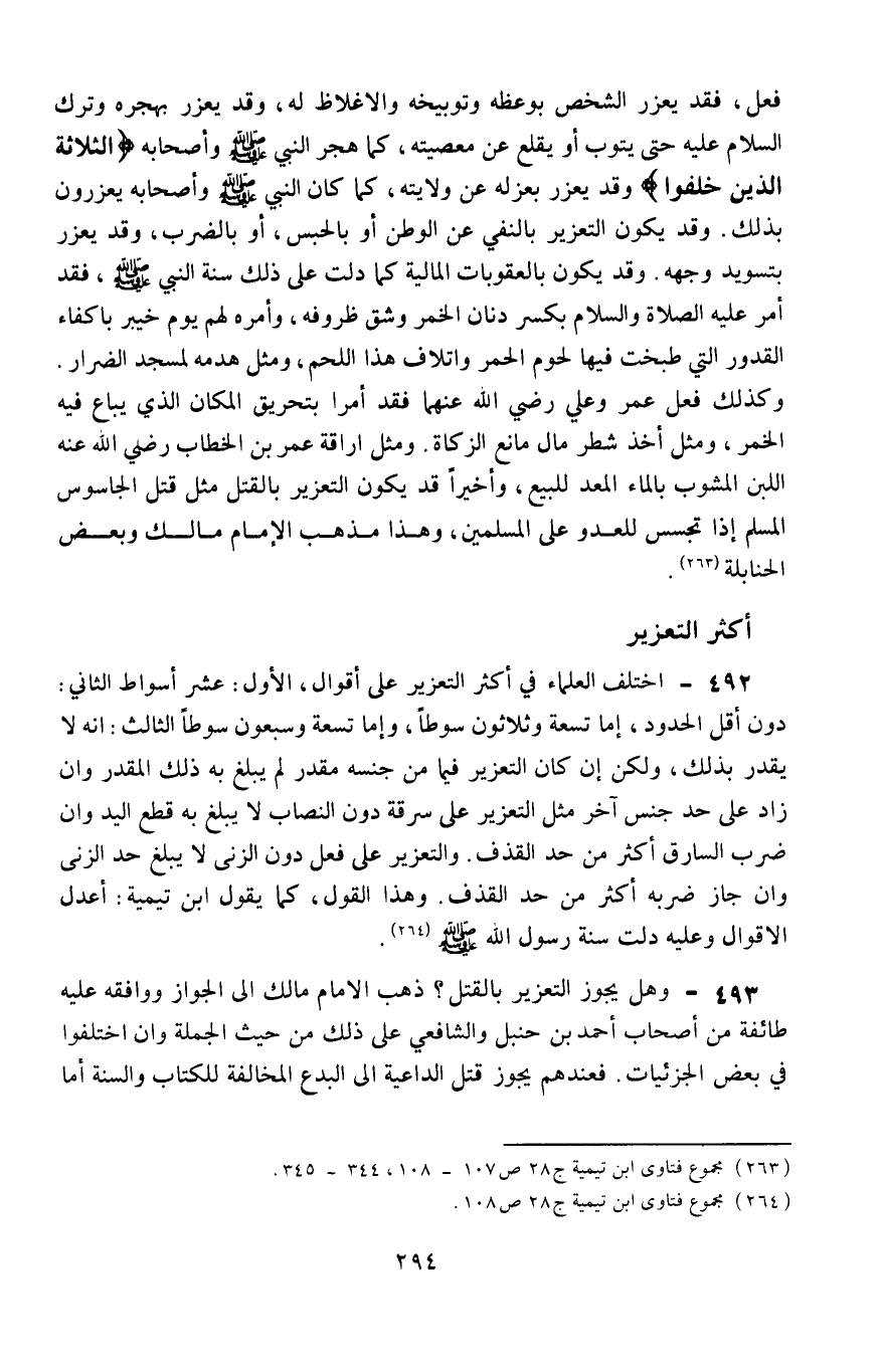 493- وهل يجوز التعزير بالقتل؟ ذهب الإمام مالك إلى الجواز، ووافقه عليه طائفة من أصحاب أحمد بن حنبل والشافعي على ذلك من حيث الجملة، وإن اختلفوا في بعض الجزئيات، فعندهم يجوز قتل الداعية إلى البدع المخالفة للكتاب والسنة، أمَّا