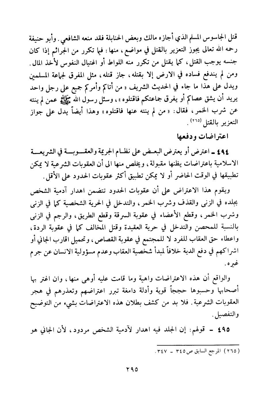 494- اعترض أو يعترض البعض على نظام الجريمة والعقوبة في الشريعة الإسلامية باعتراضات يظنها مقبولة، ويخلص منها إلى أنَّ العقوبات الشرعية لا يمكن تطبيقها في الوقت الحاضر، أو لا يمكن تطبيق أكثر عقوبات الحدود على الأقل.