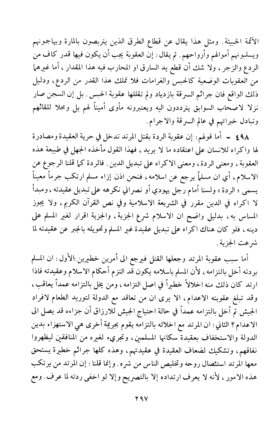 498- أمَّا قولهم: إنَّ عقوبة الردة بقتل المرتدِّ تدخل في حرية العقيدة ومصادرة لها، وإكراه للإنسان على اعتقاد ما لا يريد، فهذا القول مأخذه الجهل في طبيعة هذه العقوبة، ومعنى الردة، ومعنى الإكراه على تبديل الدِّين، فالردَّة كما قلنا: الرجوع عن الإسلام، أي أنَّ مسلمًا يرجع عن إسلامه، فنحن إذن إزاء مسلم ارتكب جرمًا معينًا يسمَّى "الردة"، ولسنا أمام رجل يهودي أو نصراني نكرِهُه على تبديل عقيدته، ومبدأ لا إكراه في الدِّين مقرَّر في الشريعة الإسلامية، وفي نص القرآن الكريم، ولا يجوز المساس به، بدليلٍ واضحٍ أنَّ الإسلام شرع الجزية، والجزية إقرار لغير المسلم على دينه، فلو كان هناك إكراه على تبديل عقيدة غير المسلم وتحويله بالجبر عن عقيدته لما شرعت الجزية.