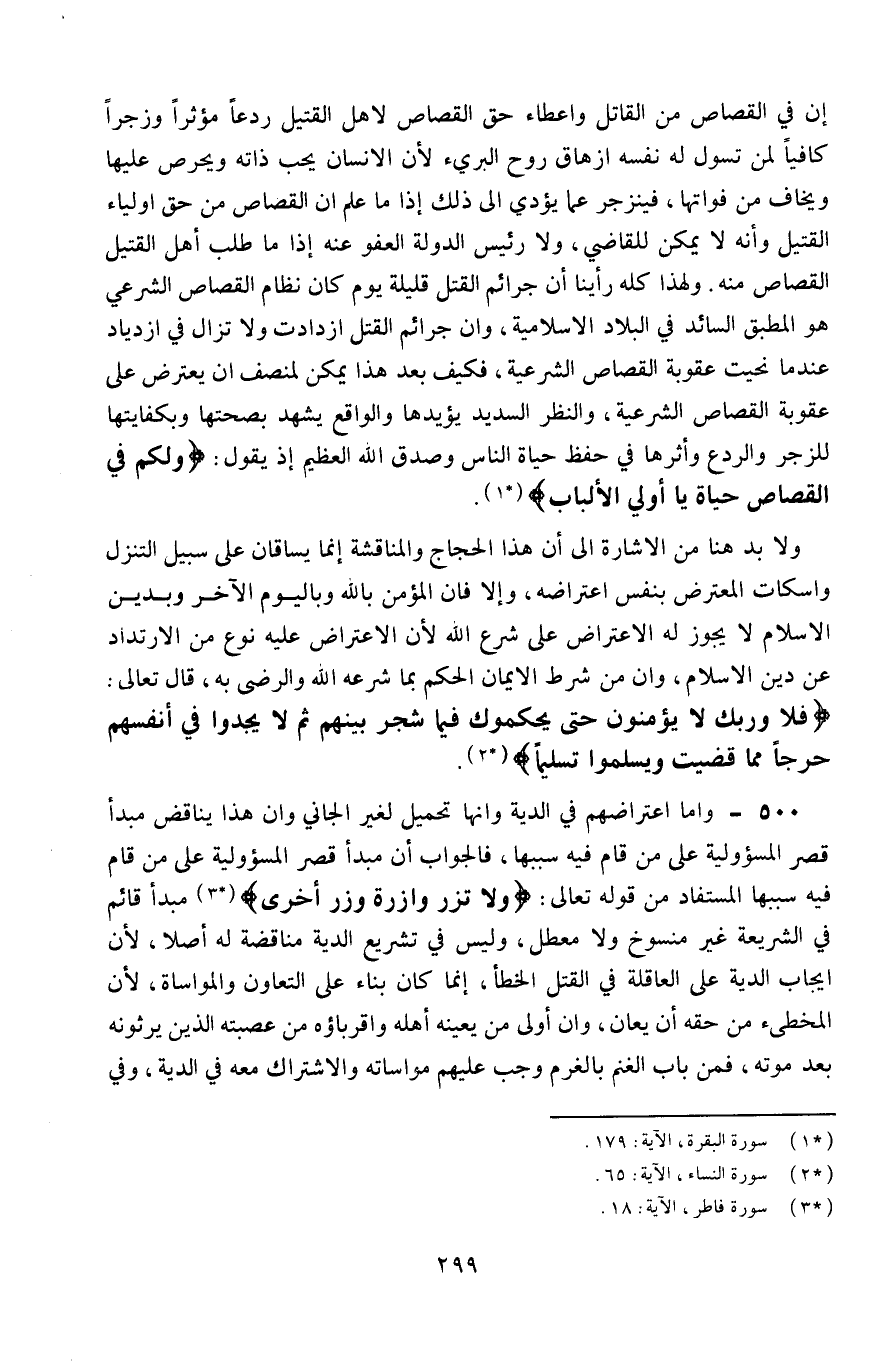 500- وأمَّا اعتراضهم في الدية وأنَّها تحميل لغير الجاني، وأنَّ هذا يناقض مبدأ قصر المسئولية على من قام فيه سببها، فالجواب أنَّ مبدأ قصر المسئولية على من قام فيه سببها، المستفاد من قوله تعالى: {وَلا تَزِرُ وَازِرَةٌ وِزْرَ أُخْرَى} 3 مبدأ قائم في الشريعة غير منسوخ ولا معطّل، وليس في تشريع الدية مناقضة له أصلًا؛ لأن إيجاب الدية على العاقلة في القتل الخطأ، إنما كان بناء على التعاون والمواساة؛ لأنَّ المخطئ من حقه أن يعان، وأنَّ أَوْلى من يعينه أهله وأقرباؤه من عصبته الذين يرثونه بعد موته، فمن باب الغنم بالغرم وجب عليهم مواساته، والاشتراك معه في الدية، وفي