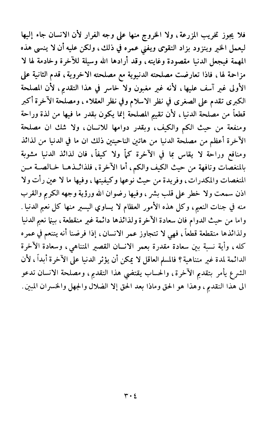 فلا يجوز تخريب المزرعة، ولا الخروج منها على وجه الفرار؛ لأن الإنسان جاء إليها ليعمل الخير ويتزوَّد بزاد التقوى، ويفني عمره في ذلك، ولكن عليه أن لا ينسى هذه المهمة، فيجعل الدنيا مقصوده وغايته، وقد أرادها الله وسيلةً للآخرة وخادمةً لها لا مزاحمة لها، فإذا تعارضت مصلحته الدنيوية مع مصلحته الأخروية قدَّم الثانية على الأولى غير آسفٍ عليها؛ لأنه غير مغبون ولا خاصر في هذا التقديم؛ لأنَّ المصلحة الكبرى تقدم على الصغرى في نظر الإسلام وفي نظر العقلاء، ومصلحة الآخرة أكبر قطعًا من مصلحة الدنيا؛ لأنَّ تقييم المصلحة إنما يكون بقدرٍ من لذة وراحة ومنفعة من حيث الكم والكيف، وبقدر دوامها للإنسان، ولا شكَّ أن مصلحة الآخرة أعظم من مصلحة الدنيا من هاتين الناحيتين، ذلك أنَّ ما في الدنيا من لذائذ ومنافع وراحة لا يقاس بما في الآخرة كمًّا ولا كيفًا، فإنَّ لذائذ الدنيا مشوبة بالمنغِّصات وتافهة من حيث الكيف والكم، أما الآخرة فلذائذها خالصة من المنغصات والمكدرات، وفريدة من حيث نوعها وكيفيتها، وفيها ما لا عين رأت، ولا أذن سمعت، ولا خطر على قلب بشر، وفيها رضوان الله ورؤية وجهه الكريم، والقرب منه في جنات النعيم، وكل هذه الأمور العظام لا يساوي اليسير منها كل نعيم الدنيا.