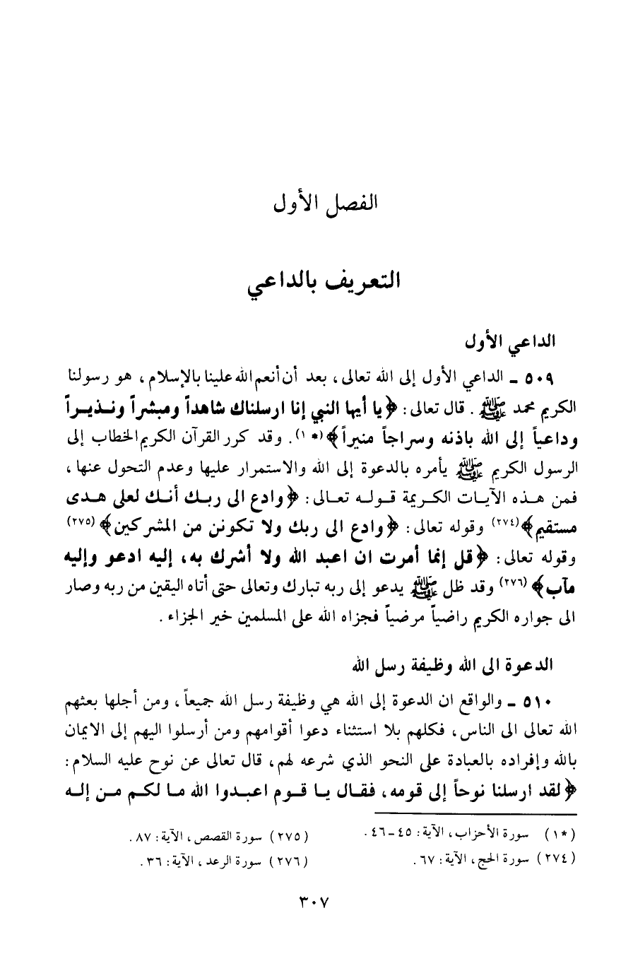 508- الداعي الأول إلى الله تعالى بعد أن أنعم الله علينا بالإسلام، هو رسولنا الكريم محمد -صلى الله عليه وسلم، قال تعالى: {يَا أَيُّهَا النَّبِيُّ إِنَّا أَرْسَلْنَاكَ شَاهِدًا وَمُبَشِّرًا وَنَذِيرًا، وَدَاعِيًا إِلَى اللَّهِ بِإِذْنِهِ وَسِرَاجًا مُنِيرًا} 1، وقد كرَّر القرآن الكريم الخطاب إلى الرسول -صلى الله عليه وسلم- يأمره بالدعوة إلى الله والاستمرار عليها وعدم التحوّل عنها، فمن هذه الآيات الكريمة قوله تعالى: {وَادْعُ إِلَى رَبِّكَ إِنَّكَ لَعَلَى هُدًى مُسْتَقِيمٍ} 2، وقوله تعالى: {وَادْعُ إِلَى رَبِّكَ وَلَا تَكُونَنَّ مِنَ الْمُشْرِكِينَ} 3، وقوله تعالى: {قُلْ إِنَّمَا أُمِرْتُ أَنْ أَعْبُدَ اللَّهَ وَلَا أُشْرِكَ بِهِ إِلَيْهِ أَدْعُو وَإِلَيْهِ مَآبِ} 4، وقد ظلَّ -صلى الله عليه وسلم- يدعو إلى ربه -تبارك وتعالى- حتى أتاه اليقين من ربه، وصار إلى جواره الكريم راضيًا مرضيًّا، فجزاه الله على المسلمين خير الجزاء.