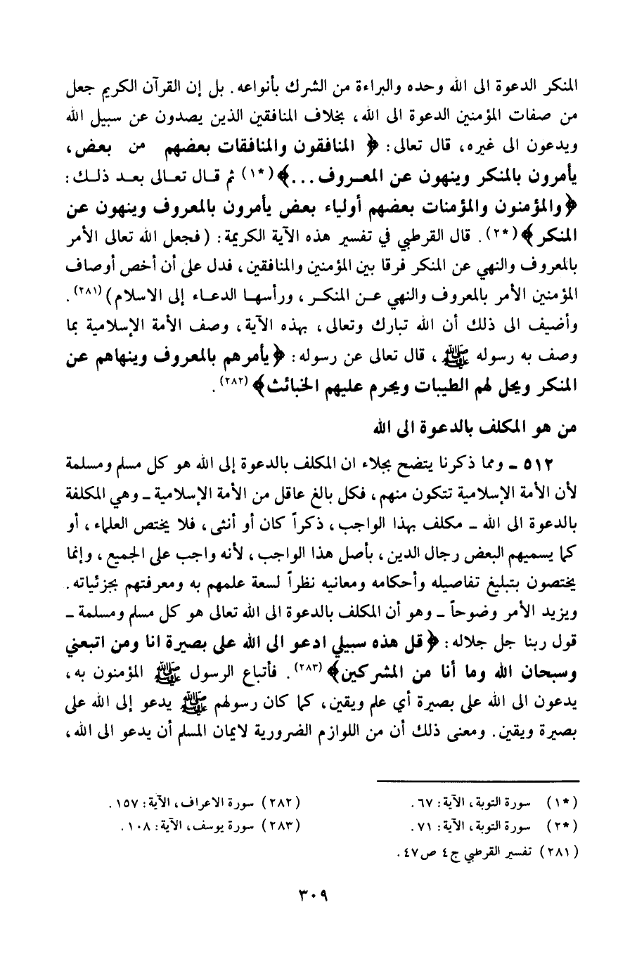 ويزيد الأمر وضوحًا -وهو أنَّ المكلَّف بالدعوة إلى الله تعالى هو كل مسلم ومسلمة- قول ربنا -جلَّ جلاله: {قُلْ هَذِهِ سَبِيلِي أَدْعُو إِلَى اللَّهِ عَلَى بَصِيرَةٍ أَنَا وَمَنِ اتَّبَعَنِي وَسُبْحَانَ اللَّهِ وَمَا أَنَا مِنَ الْمُشْرِكِينَ} 5، فأتباع الرسول -صلى الله عليه وسلم، المؤمنون به، يدعون إلى الله على بصيرة، أي: علم ويقين، كما كان رسولهم -صلى الله عليه وسلم- يدعو إلى الله على بصيرة ويقين، ومعنى ذلك أنَّ من اللوازم الضرورية لإيمان المسلم أن يدعو إلى الله،