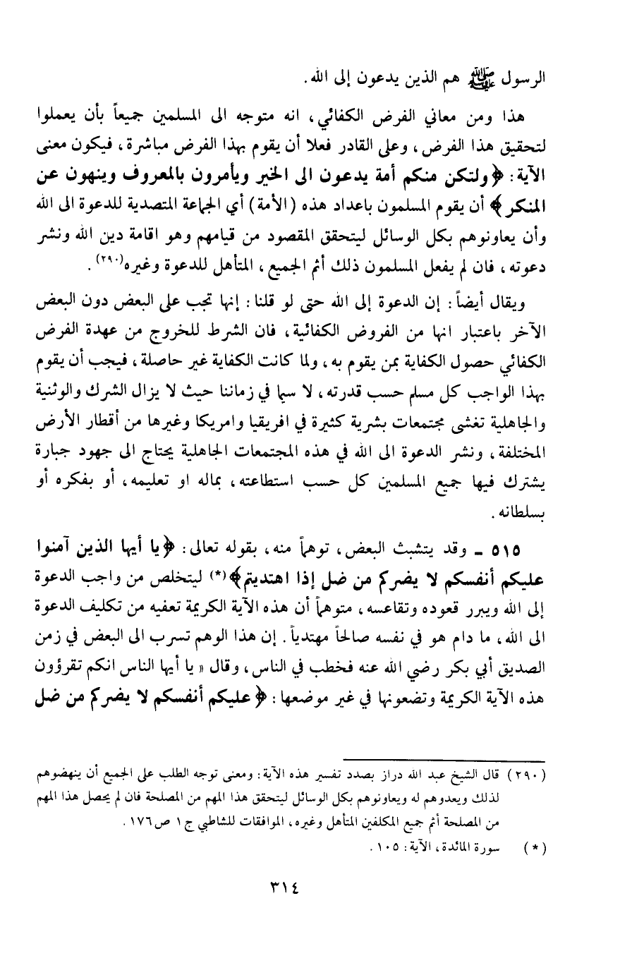 515- وقد يتشبث البعض توهمًا منه، بقوله تعالى: {يَا أَيُّهَا الَّذِينَ آمَنُوا عَلَيْكُمْ أَنْفُسَكُمْ لَا يَضُرُّكُمْ مَنْ ضَلَّ إِذَا اهْتَدَيْتُمْ} 2؛ ليتخلَّص من واجب الدعوة إلى الله، ويبرِّر قعوده وتقاعسه، متوهمًا أنَّ هذه الآية الكريمة تعفيه من تكليف الدعوة إلى الله ما دام هو في نفسه صالحًا مهتديًا. إن هذا الوهم تسرَّب إلى البعض في زمن الصديق أبي بكر -رضي الله عنه، فخطب في الناس وقال: "يا أيها الناس، إنكم تقرءون هذه الآية الكريمة وتضعونها في غير موضعها: {عَلَيْكُمْ أَنْفُسَكُمْ لَا يَضُرُّكُمْ مَنْ ضَلَّ