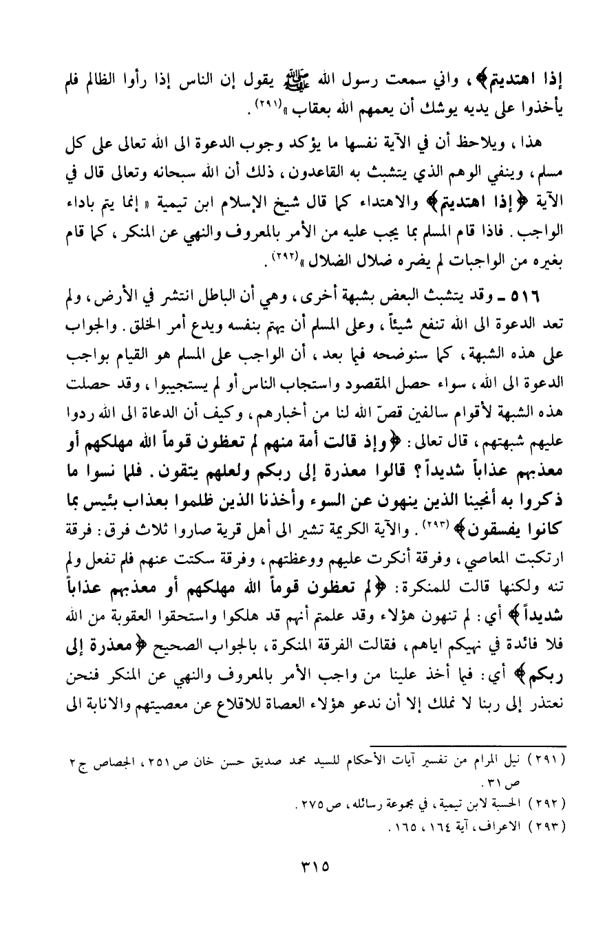 516- وقد يتشبث البعض بشبهة أخرى، وهي: إنَّ الباطل انتشر في الأرض، ولم تعد الدعوة إلى الله تنفع شيئًا، وعلى المسلم أن يهتمَّ بنفسه ويدع أمر الخلق، والجواب على هذه الشبهة كما سنوضحه فيما بعد: إنَّ الواجب على المسلم هو القيام بواجب الدعوة إلى الله، سواء حصل المقصود واستجاب الناس أو لم يستجيبوا، وقد حصلت هذه الشبهة لأقوام سالفين قصَّ الله لنا من أخبارهم، وكيف أنَّ الدعاة إلى الله ردوا عليهم شبهتهم، قال تعالى: {وَإِذْ قَالَتْ أُمَّةٌ مِنْهُمْ لِمَ تَعِظُونَ قَوْمًا اللَّهُ مُهْلِكُهُمْ أَوْ مُعَذِّبُهُمْ عَذَابًا شَدِيدًا قَالُوا مَعْذِرَةً إِلَى رَبِّكُمْ وَلَعَلَّهُمْ يَتَّقُونَ، فَلَمَّا نَسُوا مَا ذُكِّرُوا بِهِ أَنْجَيْنَا الَّذِينَ يَنْهَوْنَ عَنِ السُّوءِ وَأَخَذْنَا الَّذِينَ ظَلَمُوا بِعَذَابٍ بَئِيسٍ بِمَا كَانُوا يَفْسُقُونَ} 3، والآية الكريمة تشير إلى أهل قرية صاروا ثلاث فرق: فرقة ارتكبت المعاصي، وفرقة أنكرت عليهم ووعظتهم، وفرقة سكتت عنهم فلم تفعل ولم تنه، ولكنها قالت للمنكِرة: {لِمَ تَعِظُونَ قَوْمًا اللَّهُ مُهْلِكُهُمْ أَوْ مُعَذِّبُهُمْ عَذَابًا شَدِيدًا} أي: لم تنهون هؤلاء وقد علمتم أنَّهم قد هلكوا واستحقوا العقوبة من الله، فلا فائدة في نهيكم إياهم، فقالت الفرقة المنكرة، بالجواب الصحيح: {مَعْذِرَةً إِلَى رَبِّكُمْ} أي: فيما أخذ علينا من واجب الأمر بالمعروف والنهي عن المنكر، فنحن نعتذر إلى ربنا، لا نملك إلّا أن ندعو هؤلاء العصاة للإقلاع عن معصيتهم والإنابة إلى